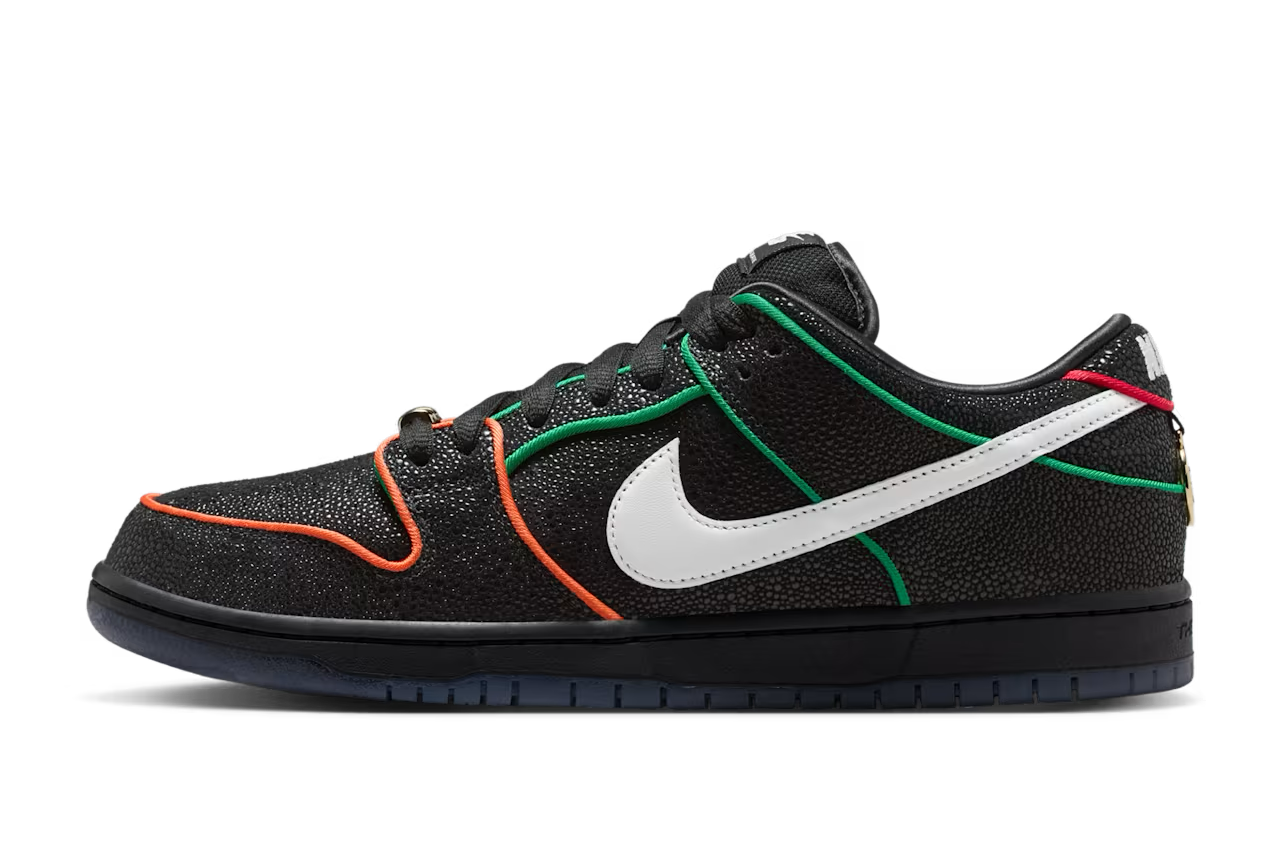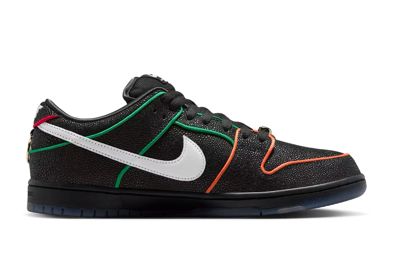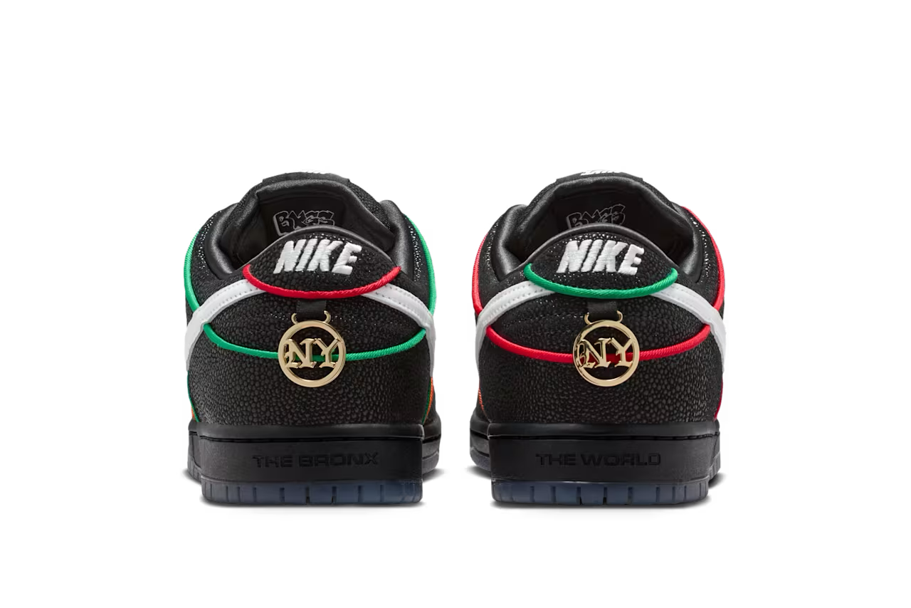 ニューヨークを拠点とするスケートチーム「ブロンクス ガールズ スケート」と「ナイキ」による注目のコラボSB ダンク ローがスタンバイ。本作は、エイのような質感を持つブラックのアッパーに、レッド×オレンジ×グリーンのパイピングとホワイトスウッシュを組み合わせた大胆なルックスが特徴だ。BXGSの刻印入りゴールドデュブレやグラフィック入りインソール、NY地下鉄の橋を描いたアウトソールなど、NYカルチャーを象徴するディテールが満載。多様なバックグラウンドを持つスケーターたちの団結をメッセージとして込めた一足に仕上がっている。