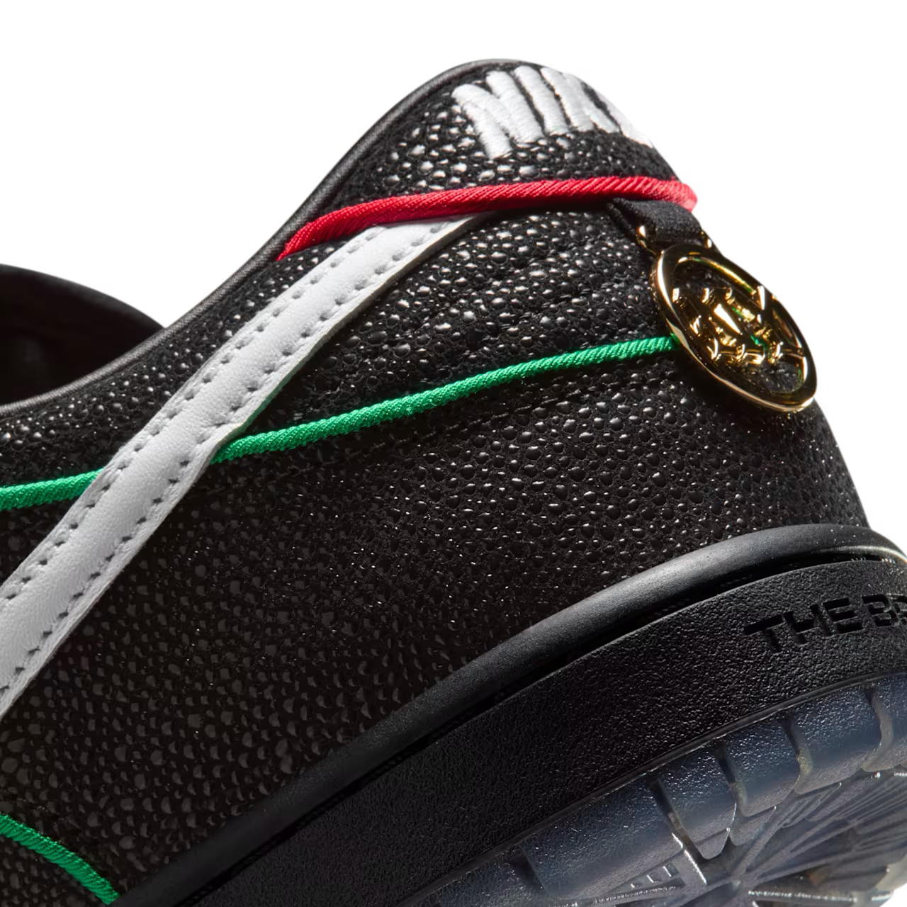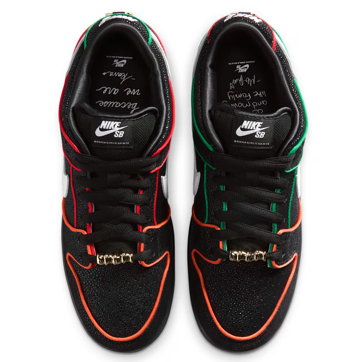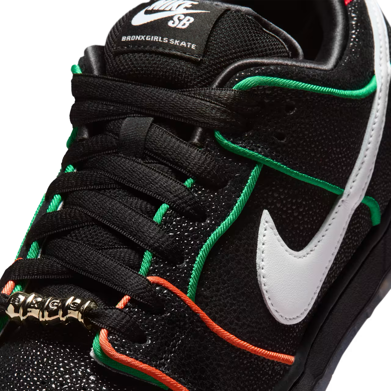 ニューヨークを拠点とするスケートチーム「ブロンクス ガールズ スケート」と「ナイキ」による注目のコラボSB ダンク ローがスタンバイ。本作は、エイのような質感を持つブラックのアッパーに、レッド×オレンジ×グリーンのパイピングとホワイトスウッシュを組み合わせた大胆なルックスが特徴だ。BXGSの刻印入りゴールドデュブレやグラフィック入りインソール、NY地下鉄の橋を描いたアウトソールなど、NYカルチャーを象徴するディテールが満載。多様なバックグラウンドを持つスケーターたちの団結をメッセージとして込めた一足に仕上がっている。