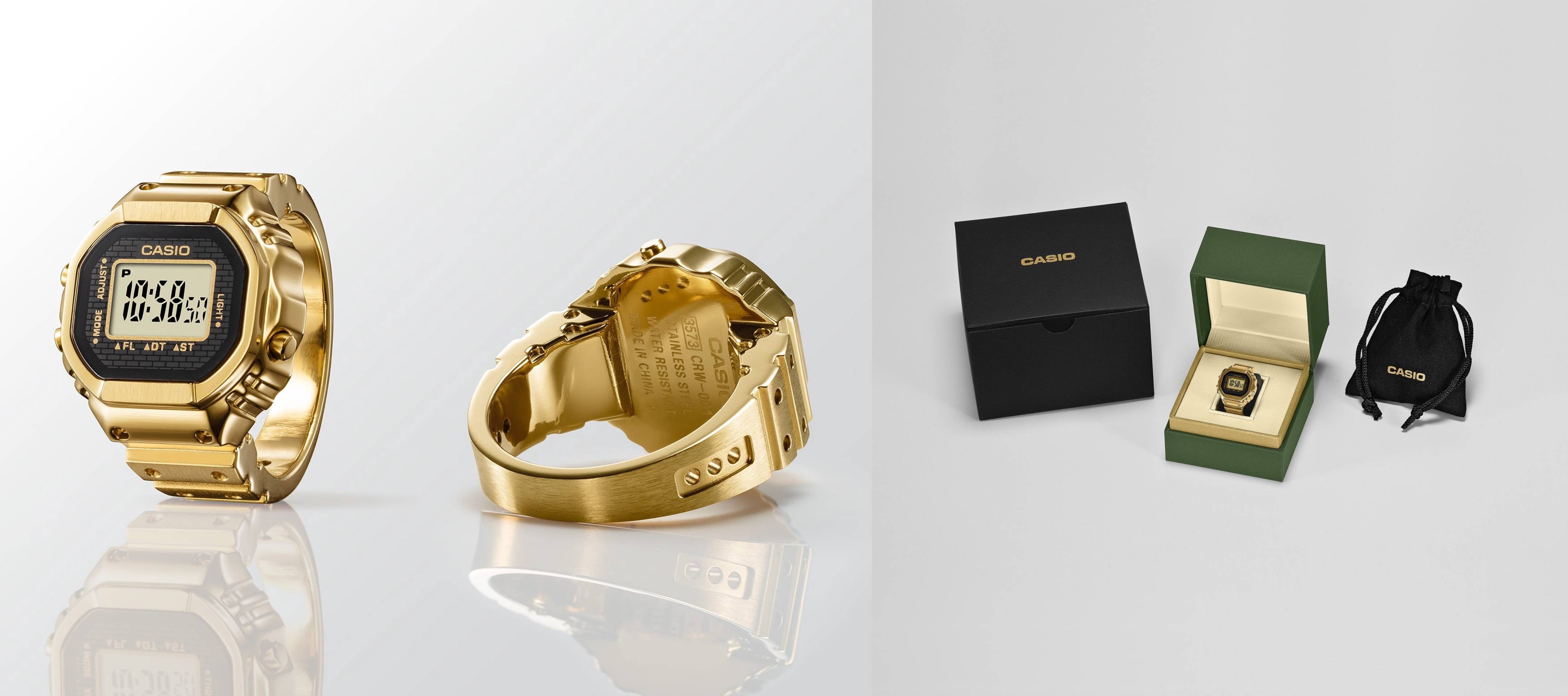 「カシオ」から、腕時計の機能とデザインを指輪サイズに凝縮したゴールドのリングウォッチ「CRW-001G-9」が登場する。本アイテムの最大の特徴は、カシオが長年培ってきた精密実装技術を駆使し、一般的な腕時計用モジュールを約10分の1のサイズにまでダウンサイジング。この極小モジュールと小型ボタン電池を組み合わせることで、デジタルウォッチを指輪という新しい形で実現した点だ。リング本体の素材にはステンレススチールを採用しているほか、表面にはゴールドカラーのイオンプレーティングが施され、高級感のある輝きが大きな注目を浴びること間違いなし。カシオの技術力と遊び心が融合した本アイテムは、ファッションアイテムとしてだけでなく、ガジェット好きの心もくすぐる、未来的な逸品と言える。
