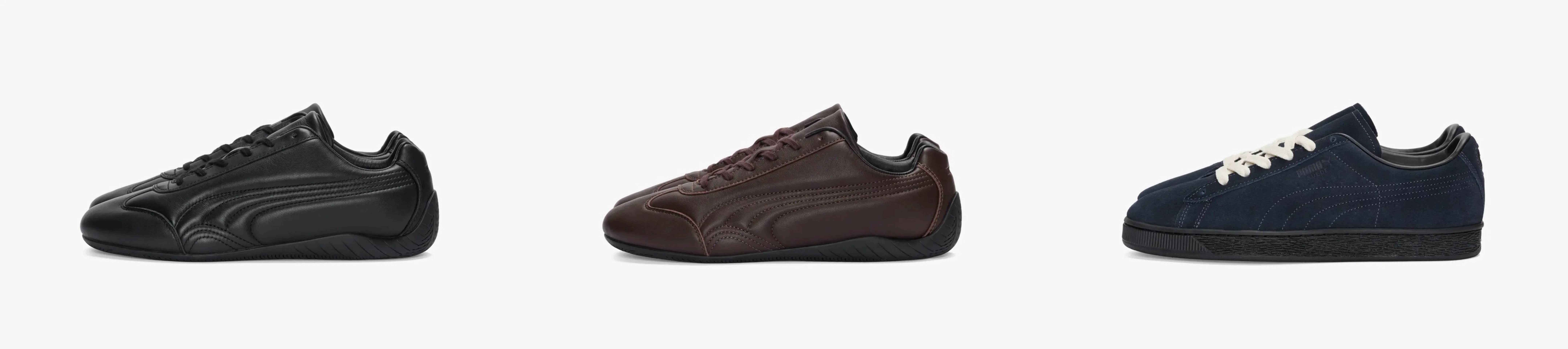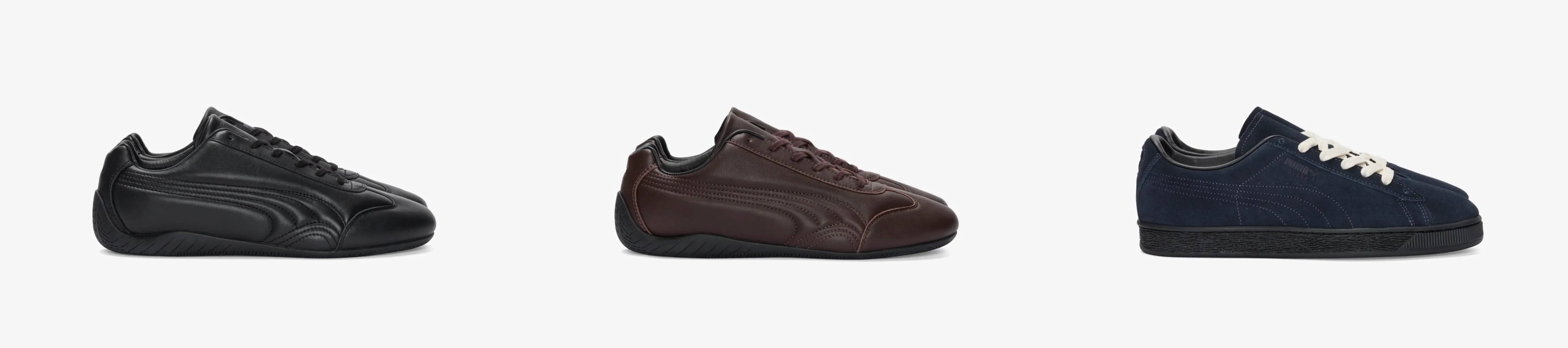 スニーカーは、プーマのアーカイブから2つのアイコンモデルをジョウンドの視点で再解釈。モータースポーツのDNAを受け継ぐ「スピードキャット」は、"ブラック"と"ブラウン"の2色展開。一方、プーマの歴史を象徴する「スウェード」は、洗練された"ネイビー"をまとって登場する。