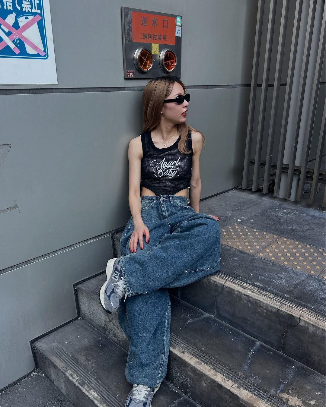 最後に紹介するのは、2000年代初頭のストリートシーンを彷彿とさせるY2Kコーディネート。透け感のあるクロップドタンクトップにボリュームのあるバギーデニムを合わせ、足元にはグレーの「2002R」をチョイス。トレンド感あふれる着こなしを、スニーカーが持つ普遍的な魅力で引き締め、全体の完成度を高めている。