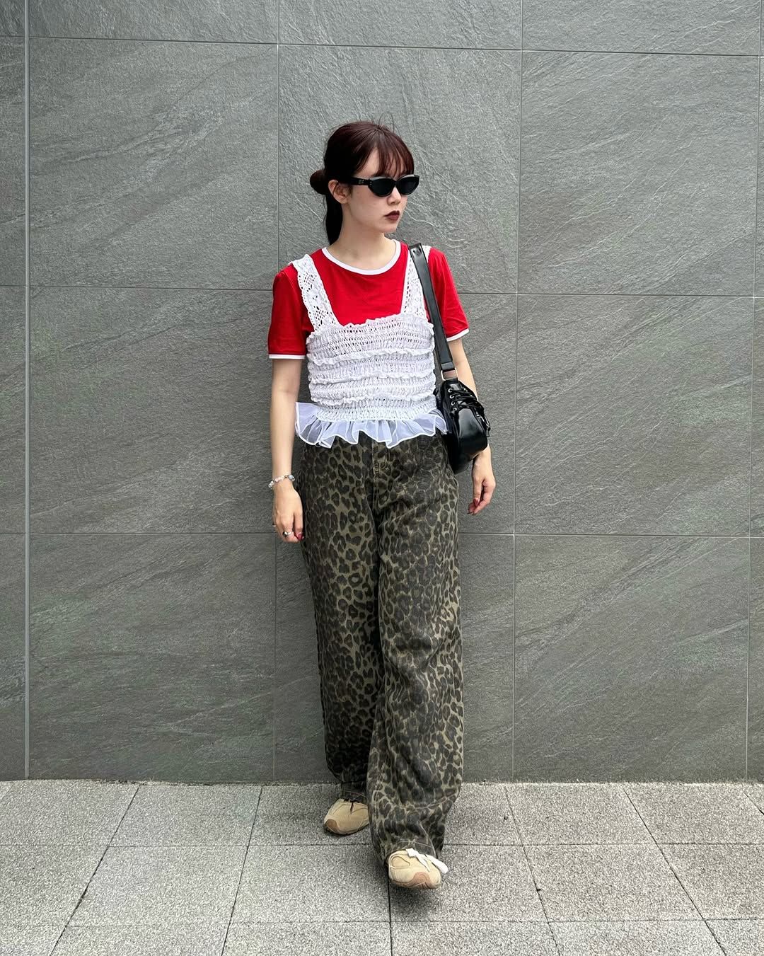 まず紹介するのは、レースやシャーリングが特徴的なフェミニンなビスチェを主役に、インパクト抜群のレオパード柄ワイドパンツを合わせたミックススタイル。主張の強いアイテム同士の組み合わせを、「ミュウミュウ」コラボの淡いベージュをまとった「530」とブラックの小物でまとめ上げ、洗練されたストリートコーデを完成させている。