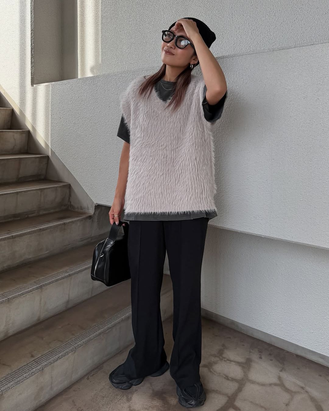 毛足の長いシャギーニットベストを主役にした、異素材ミックスのコーディネート。質感のコントラストが、モノトーンコーデにありがちな単調さを回避し、深みを与えているのが特徴だ。「9060」のチャンキーなソールが全体の重心を下げ、安定感のあるシルエットを構築している。