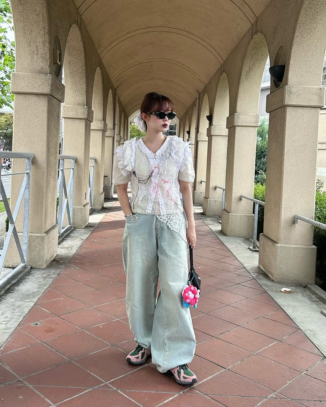 ロマンティックなムードのブラウスと、Y2Kを感じさせるバギーデニム、そしてテック系のスニーカーという、全く異なるテイストを大胆に掛け合わせたミックススタイル。レースやフリルが繊細なトップスに対し、あえて無骨なトレイルランニングシューズ「 610」を合わせるハズしのテクニックが光る。トレンドを巧みに取り入れた、計算されたスタイリングと言えるだろう。