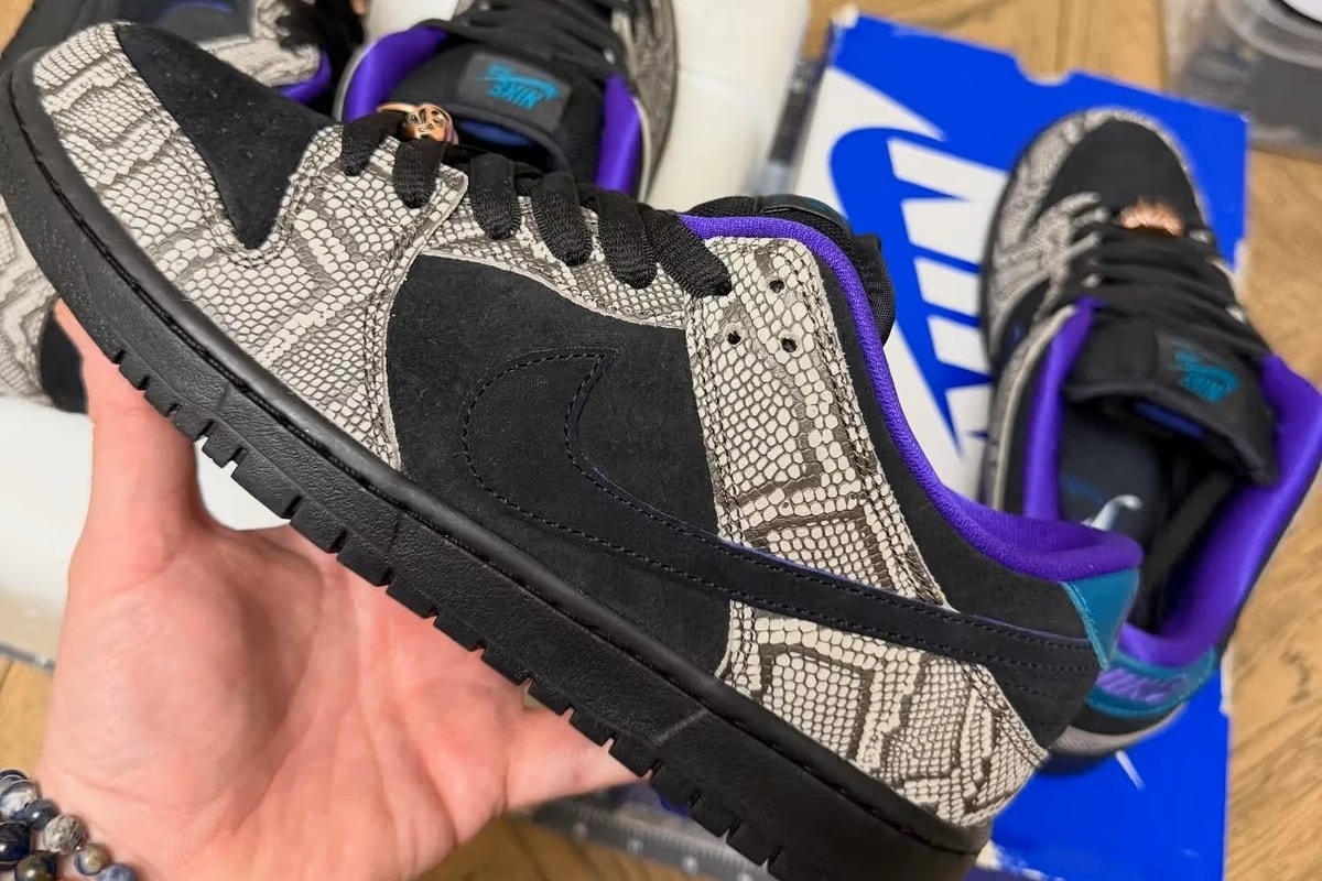 「ナイキ」から、プロスケーターであるダショーン・ジョーダン氏との新作コラボモデルが登場するようだ。ベースとなるのは、スケートシーンで絶大な人気を誇るSB ダンク ロー。今作は、彼の故郷であるアリゾナの砂漠地帯と、そこに生息するガラガラヘビからインスピレーションを得ている。アッパーは、フェイクスネークスキンのオーバーレイと、ブラックスウェードのアンダーレイで構成。ティール、フィアスパープル、ダークラセットといった色彩が、ニュートラルなベースの上で鮮やかなコントラストを生み出している。シュータンには、ターコイズブルーのSBロゴと共にダショーン氏の名前が刺繍されている点も見逃せない。さらに、ガラガラヘビの牙を模したユニークなレースデュブレが、このモデルのテーマ性をより一層際立たせる。オンボードでもオフボードでも活躍してくれる一足に注目してほしい。