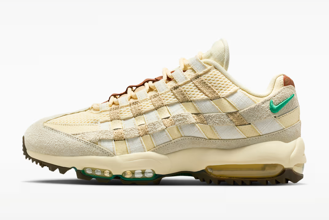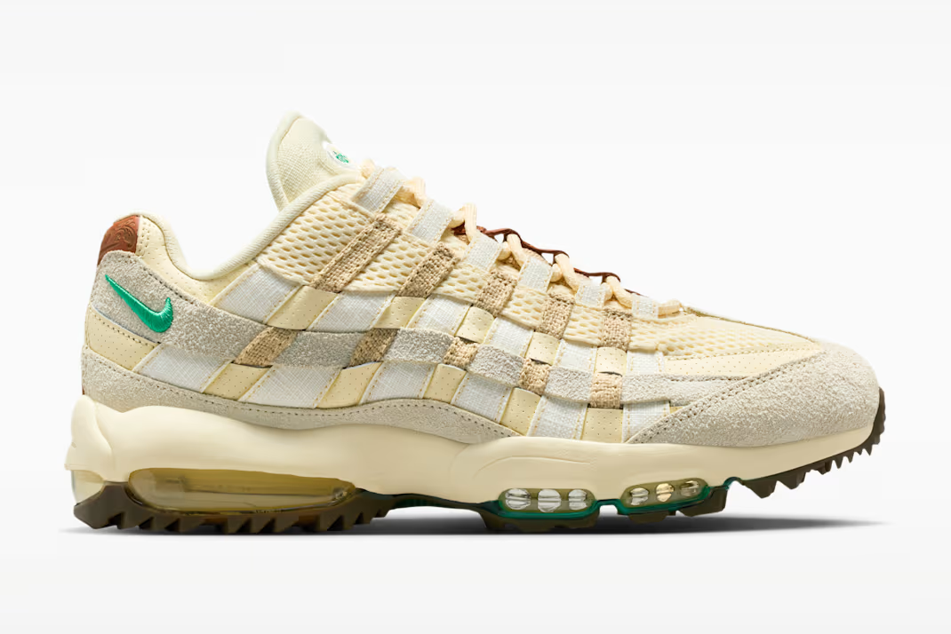 「ナイキ」より、名作エアマックス95をゴルフ用にチューニングしたエアマックス95 ゴルフの新カラーがリリースされる。今作は、ゴルフ界の激しい対決の舞台となる太陽に照らされた荒野と、そこを駆け回るカウボーイの物語をデザインソースとした一足だ。アッパーにはココナッツミルクやサミットホワイトといったクリーンなカラーを配しつつ、カウボーイの装備を彷彿とさせるタフな素材使いで耐久性を確保。スウッシュなどの各所に配した、荒野の植物をイメージしたであろうスタジアムグリーンがアクセントとして効いている。ソールユニットにはゴルフスイングに最適化されたグリップ力を備えつつ、最大の特徴であるビジブルAirが、ラウンド中の長距離移動でも疲れを感じさせない弾むような履き心地を提供。機能性とアイコニックな造形美を融合させた今作は、ゴルフはもちろんデイリーシーンでも活躍してくれそうだ。