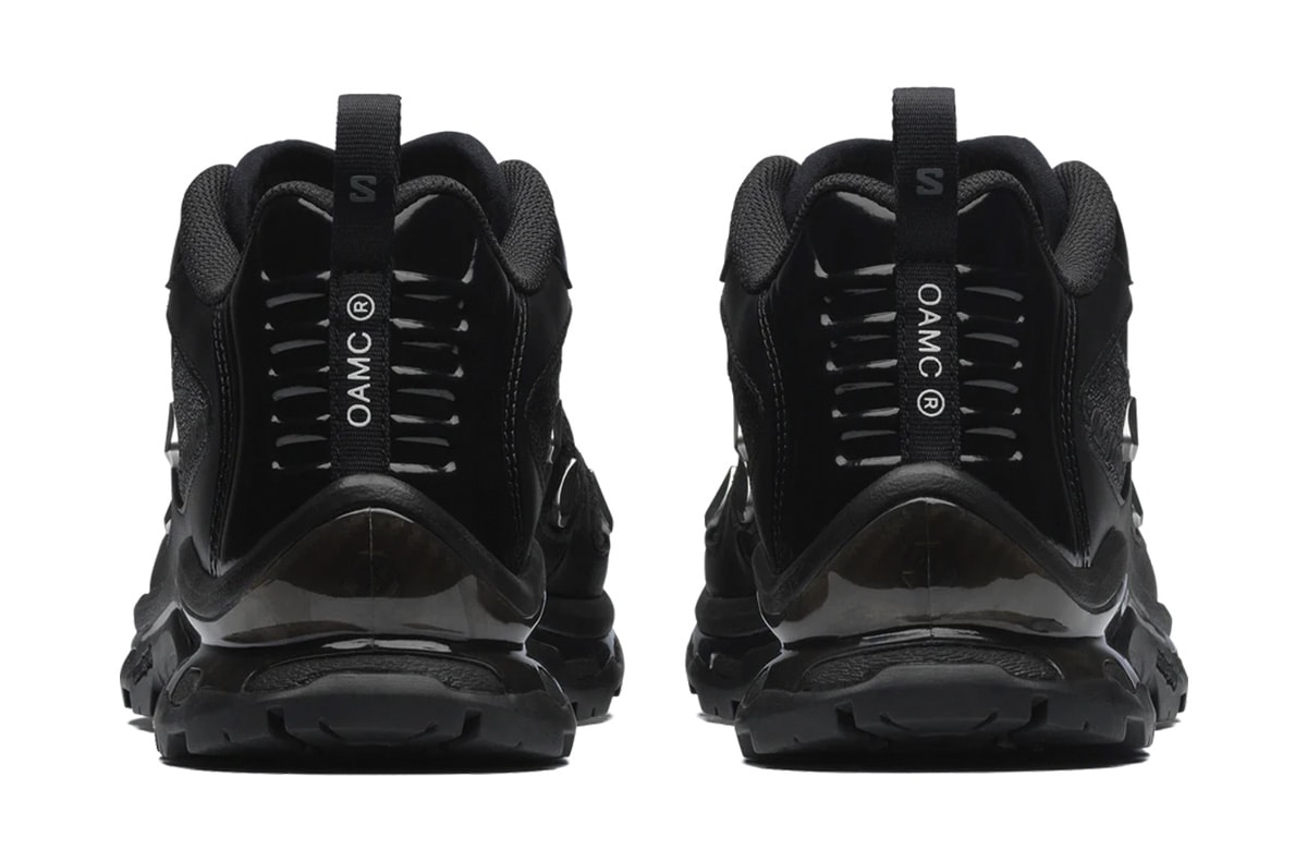 今作は、耐久性に優れたナイロンファブリックと、上質なスムースレザーや同色の異素材を組み合わせ、ブラックを基調とした都会的なルックスに仕上げた。シューレース部分を覆うレースシュラウドや、各所に配されたメタリックシルバーのパーツが、OAMCらしい構築的でエッジの効いた美学を体現している。