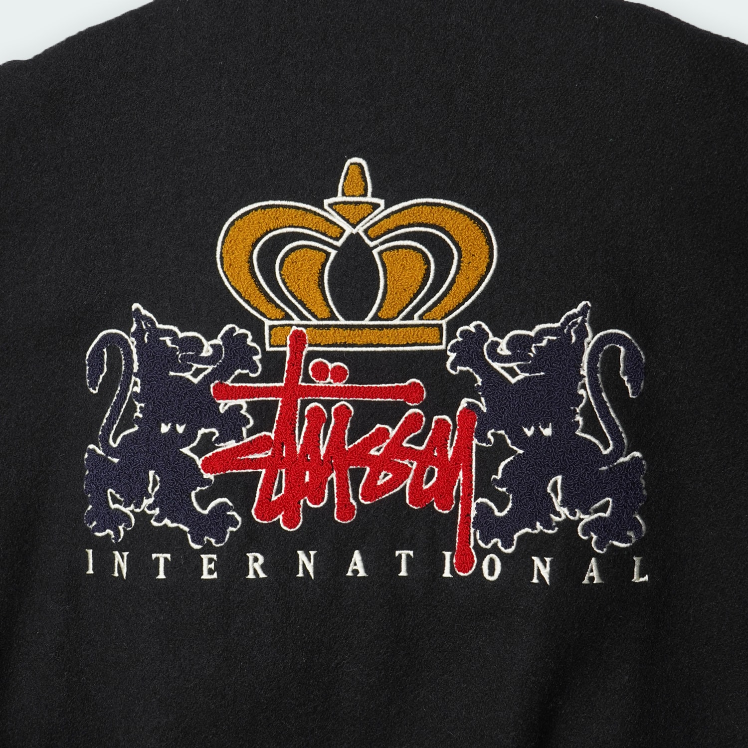 "グリフィンとクラウンの刺繍が施されたスタジャン。90sらしいデザインと丈感が今着たいシルエットに。Lサイズ。
