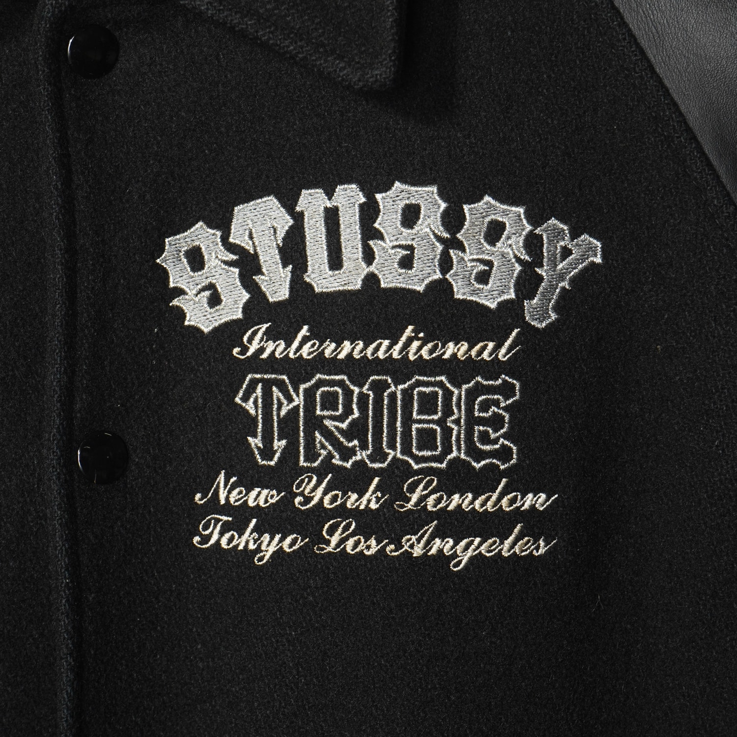 "stussyの主要都市4つの地名が刺繍されたスタジャン。ニューヨーク・ロンドン・東京・ロサンゼルスの4都市限定で販売されたリミテッドエディションの98年の復刻モデル。希少価値も高く人気のOLD STUSSY。Mサイズ。