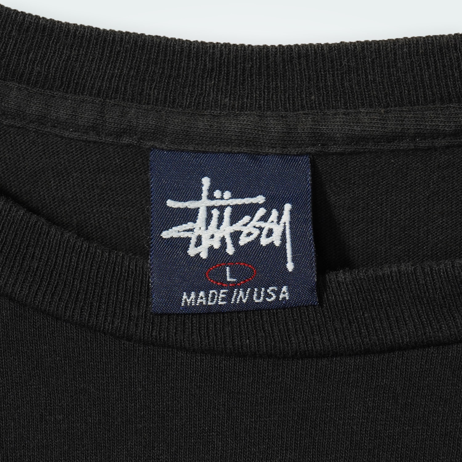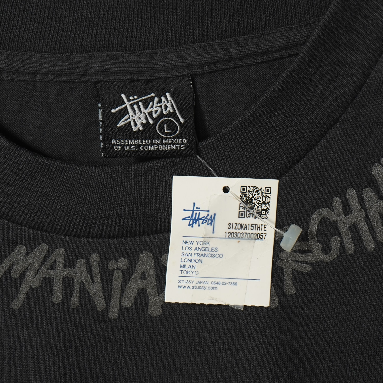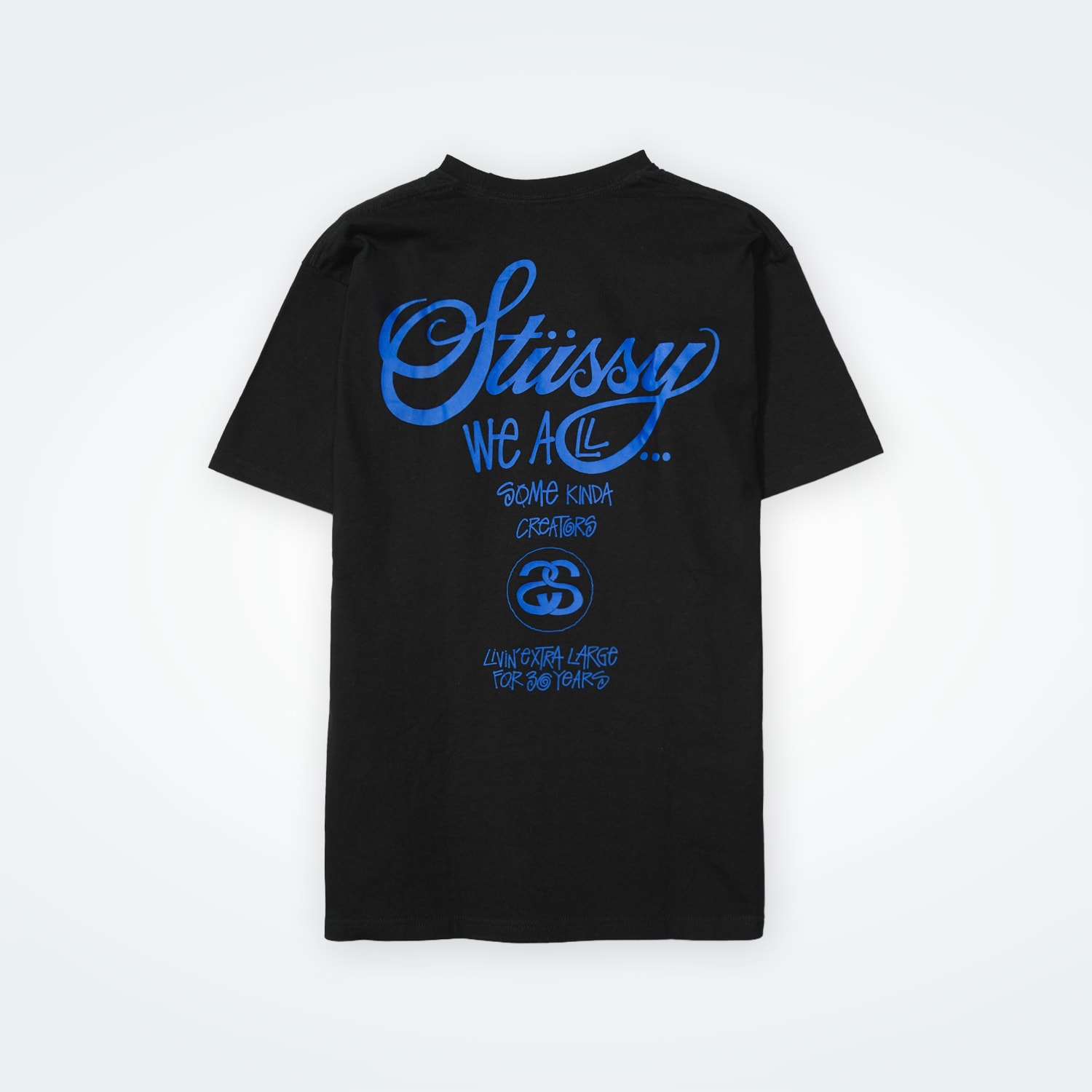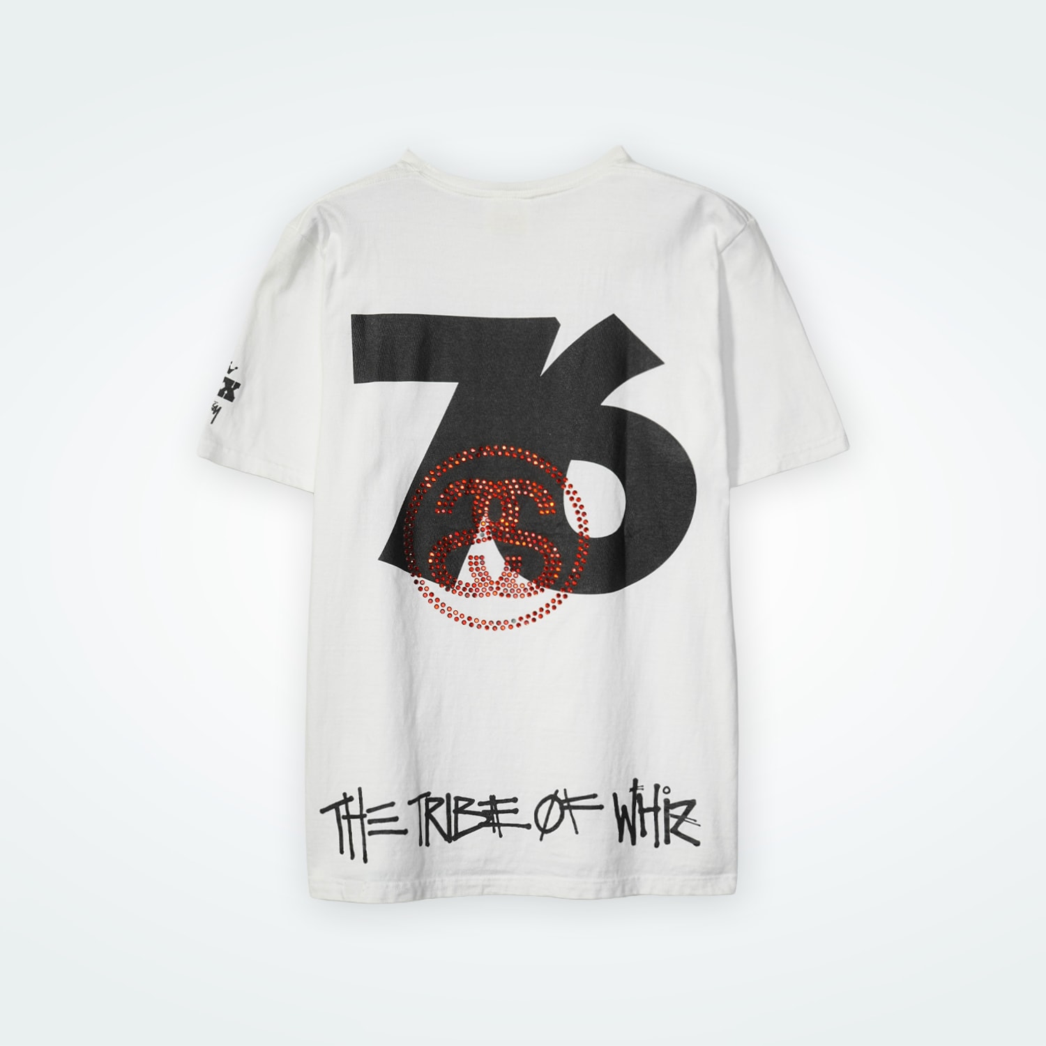 STUSSYブランド設立30周年を記念して、ブランド「WHIZ」とコラボした希少アイテム。スカルアイコンのシルクスクリーンプリントに加え、ラインストーン調のSSリンクロゴも配置された特別仕様。Lサイズ。