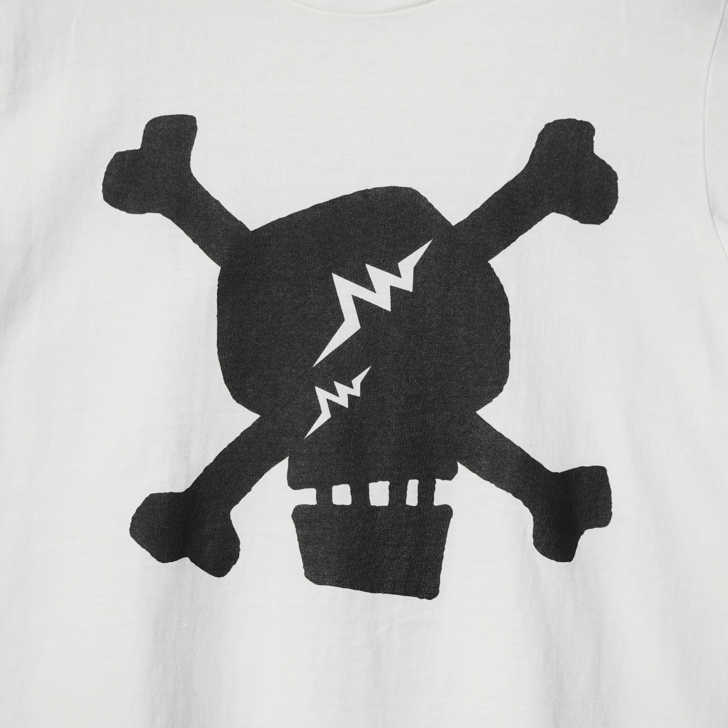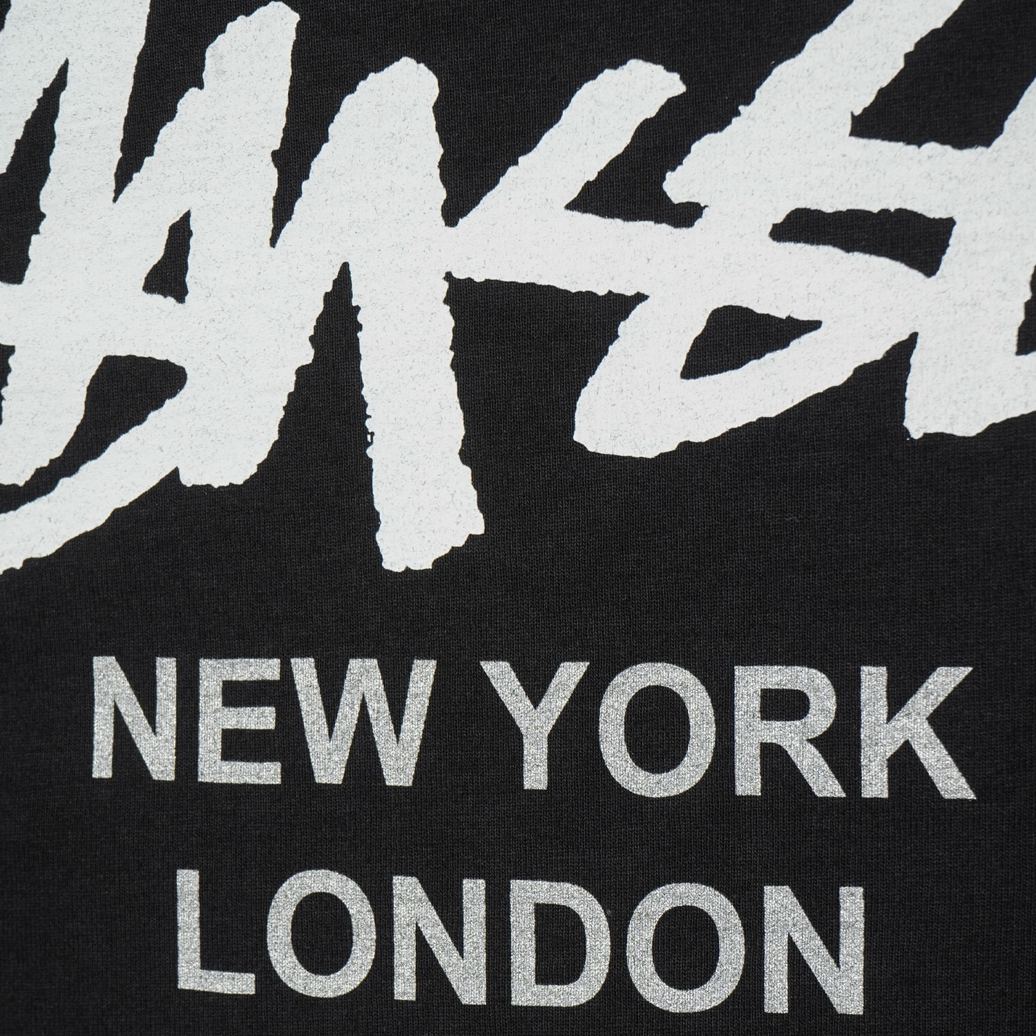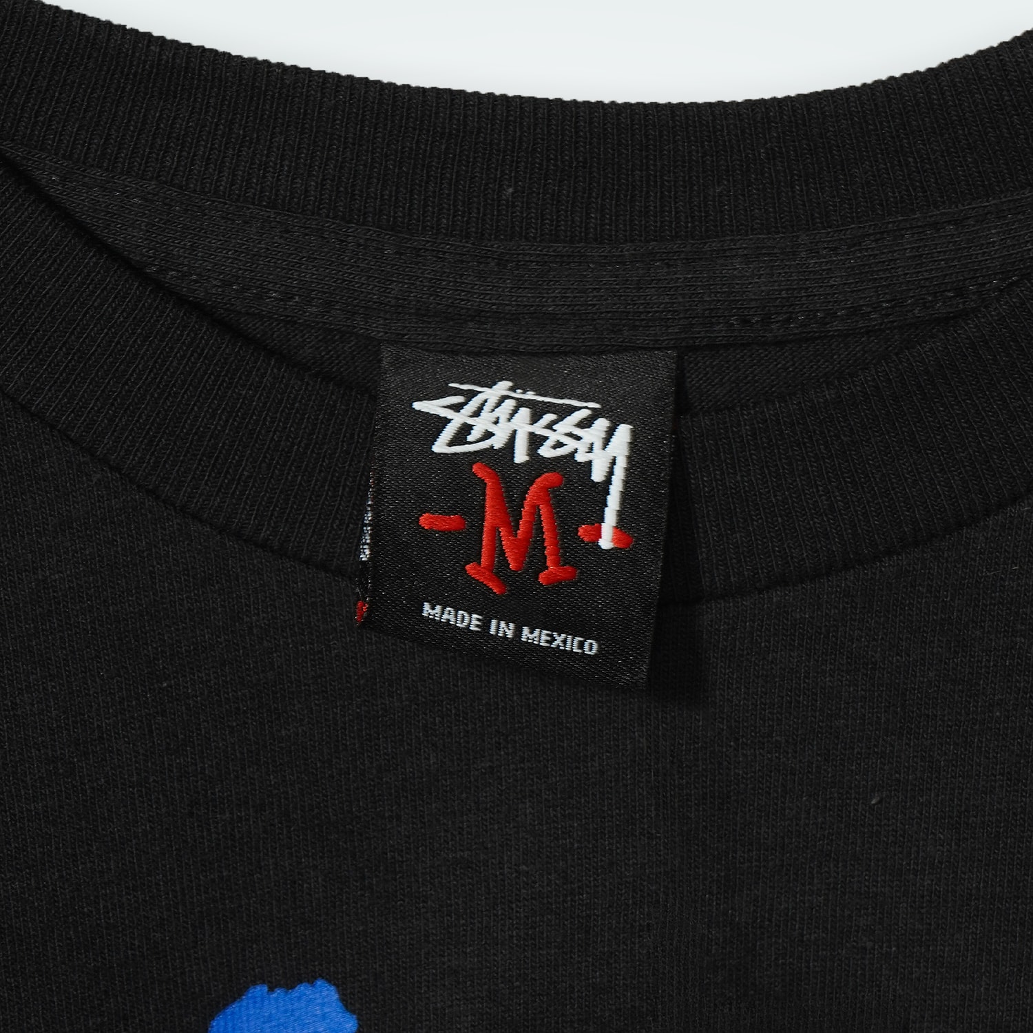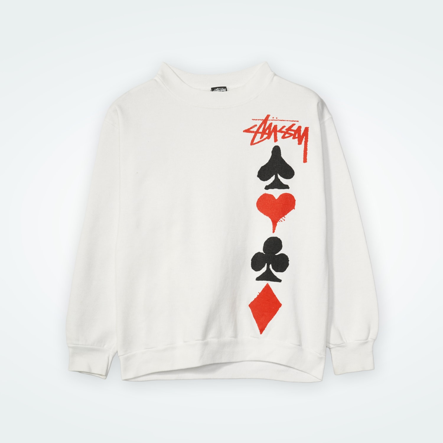 STUSSYブランド設立30周年を記念して、ブランド「WHIZ」とコラボした希少アイテム。スカルアイコンのシルクスクリーンプリントに加え、ラインストーン調のSSリンクロゴも配置された特別仕様。Lサイズ。