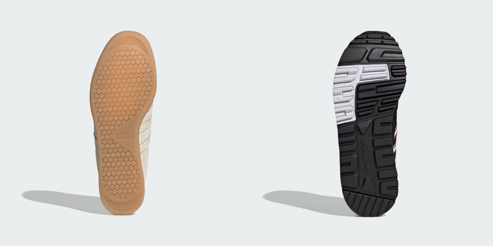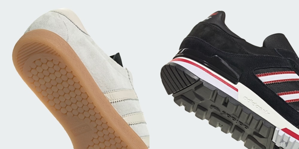 ZX 600は、多層的なパーツ構成やヒールパッチのトレフォイルなど、80年代ランニングシューズのメカニカルなディテールを忠実に再現。高いグリップ力を備えた厚手のラバーアウトソールも相まって、街歩きでも頼れるタフな一足だ。
