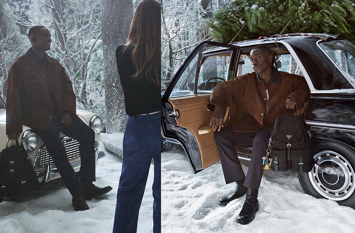 このスタイルでは、重厚なスウェード素材のバーンジャケットに端正なスラックスを合わせ、ワーク特有の土臭さを抑制。加えて、足元のレザーシューズまでダークトーンで統一することで、全体の印象をシャープに引き締めている。「プラダ」が得意とする、実用着を都会的に落とし込んだ模範的なスタイリングだ。