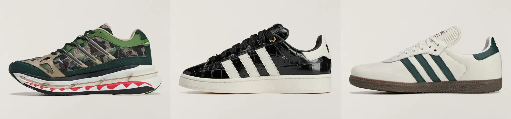 サンバは、サイドパネル外側にBAPE STA、内側にスリーストライプスを配したアシンメトリーな仕様となっており、ホワイトとグリーンの配色がクリーンな印象をもたらす。一方のキャンパス00sは、ブラックのクロコ型押しレザーを採用。随所に施したゴールドメタリックがラグジュアリーさを強調している。さらにアディスター HRMYにはBAPEの代名詞ABCカモとシャークグラフィックを大胆に配置。ストリート、スタジアム問わず、抜群の存在感を放つ一足だ。4年に一度のワールドカップを祝う、3足にぜひ注目してみよう。