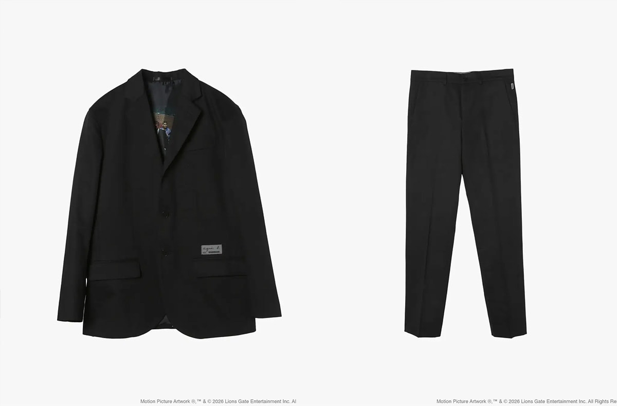 注目すべきは、アニエスベーの象徴であるブラックスーツをベースにしたセットアップで、ジャケットの裏地には映画の象徴的なシーンを採用。ブラックの色調が物語の不穏な色気を演出しつつ、コットン100%素材により日常から特別なシーンまで幅広く対応する一着に仕上がっている。