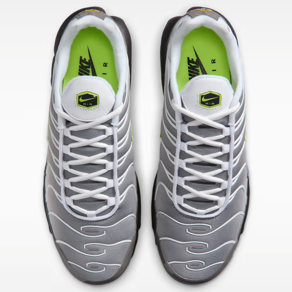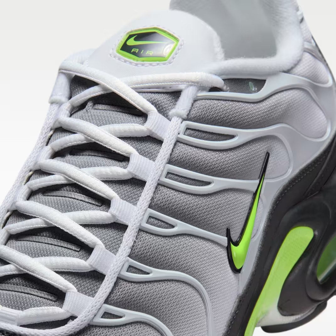 メッシュアッパーには、ホワイトからパールグレーへと変化する美しいグラデーションを施し、そこへホワイトのTPUオーバーレイ(ケージ)を重ねることで、流麗かつ力強いシルエットを強調している。足元にはダークヌバックのマッドガードとブラックのミッドソールを配置。重厚な質感を加えることで、随所に配したネオンイエローのコントラストをより鮮明に際立たせた。また、ヒールの「Tnロゴ」といった象徴的なディテールはそのままに、ソールに搭載されたクッショニングシステム「Tuned Air(チューンドエア)」のユニット内部もネオンカラーで彩っている。