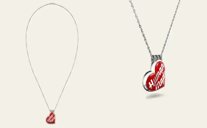デザインの主役はヒューマンメイドを象徴するハートロゴであり、ベースには重厚な輝きを放つ925スターリングシルバーを採用。ロゴ中央の3本線には、厳選された14石のホワイトダイヤモンドを精緻にセッティングし、ストリートのアイコンに圧倒的なラグジュアリー感をもたらしている。長さ調整が可能な約51cmのチェーンが付属し、ペンダントトップの細部に至るまで熟練の職人技が光る仕上がりだ。ストリートとハイジュエリーが交差する豪華コラボアイテムを、ぜひチェックしてみてほしい。