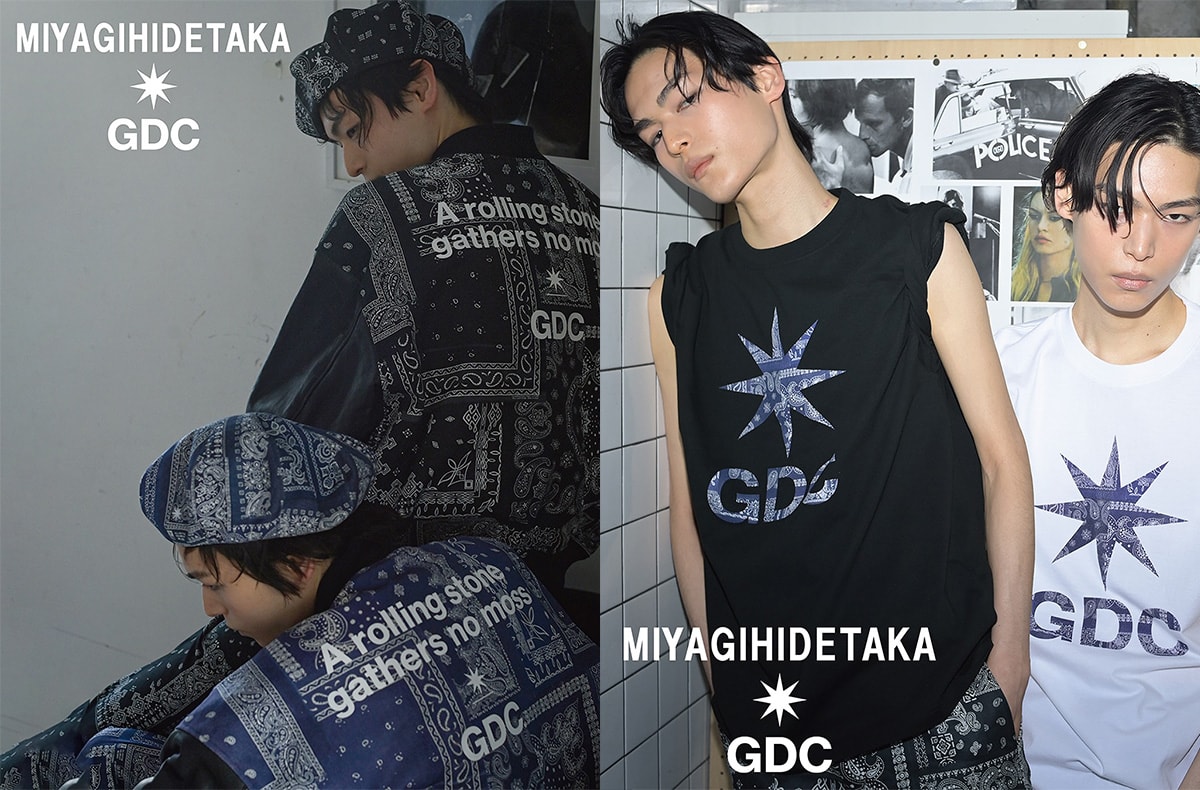 デザイナー宮城秀貴氏による「ミヤギヒデタカ」と熊谷隆志氏が手掛ける「GDC」のタッグから、待望のコラボコレクションが登場する。今回は、GDCを象徴する普遍的なシルエットをベースに、宮城氏のアイデンティティであるバンダナ柄を落とし込んだ全9型のカプセルコレクションだ。