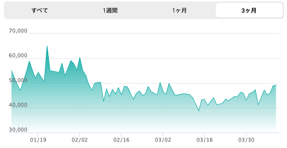 過去の名作を忠実に再現することで高い人気を誇る「LEVI'S® VINTAGE CLOTHING(LVC)」シリーズの一品。ここ3ヶ月の価格推移を見ると一度は¥65,000という高値で売買されたが、その後は多少の上がり下がりを見せながらも落ち着きつつあった。しかし3月の半ばに定価を切ったあたりから、再び上昇傾向となっているようだ。