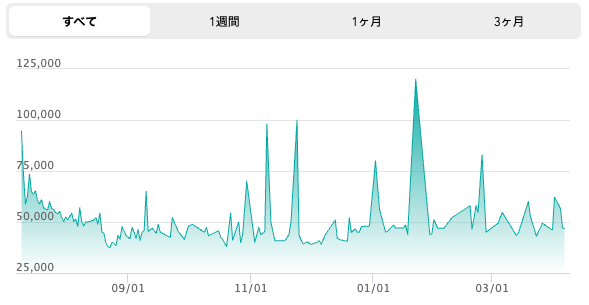 今年の2月にエアジョーダン3と同時にリリースされて話題を集めた、ジョーダンとのコラボアイテム。グラフを見ると価格が激しく上下している印象を受けるが、安い時で¥20,000に対して高い時で約¥26,000となっており、そこまで大きな差と感じない人もいるかもしれない。これを許容できるなら、ほしい時にゲットするもの手だ。