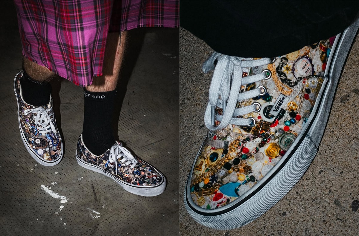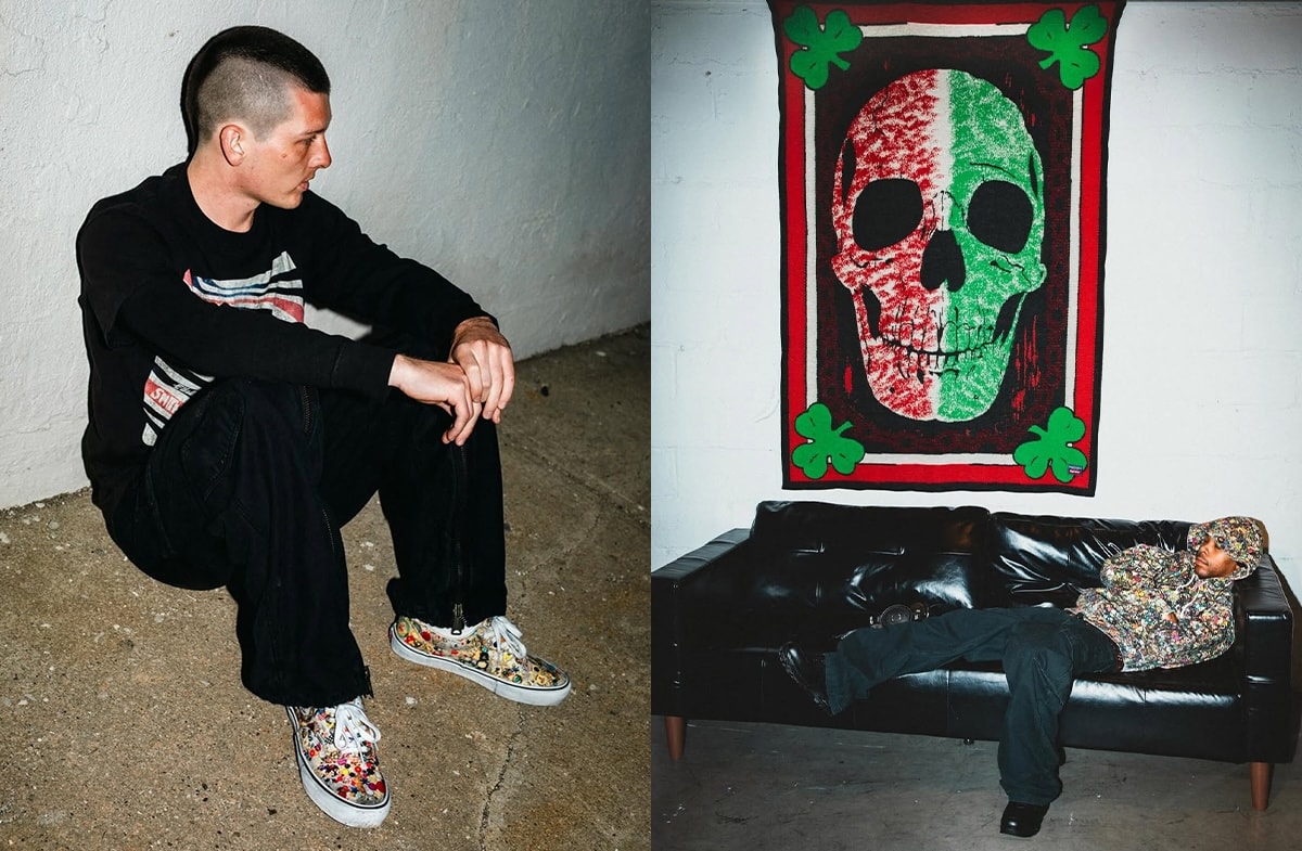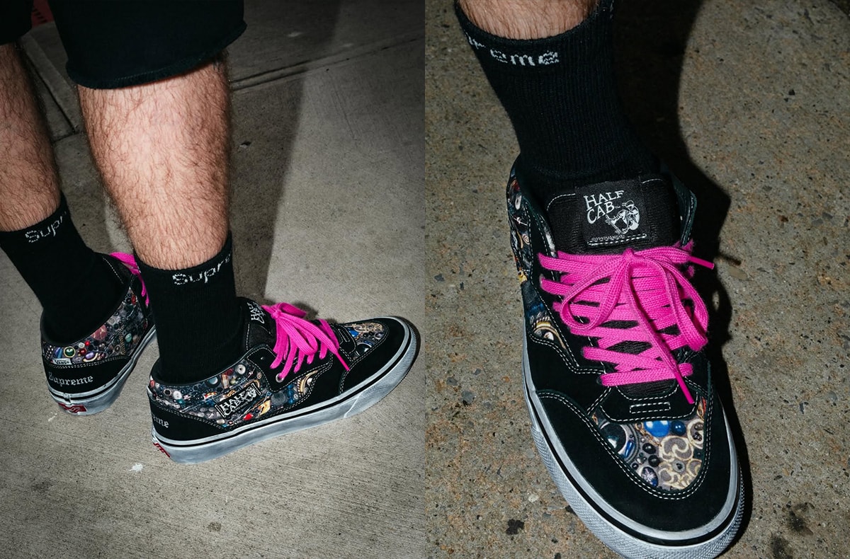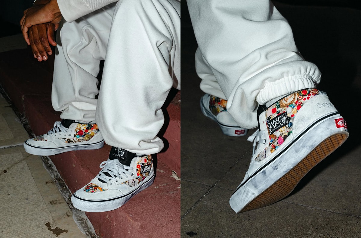 また、「バンズ」とのトリプルコラボとなるエラとハーフキャブも同時にラインナップ。エラは、キャンバス素材のアッパー全面に彼を象徴するパッチワークやぬいぐるみをモチーフにしたグラフィックをプリント。一方ハーフキャブは、スウェードとキャンバスを組み合わせたアッパーに、ヒール部分やサイドパネルへ繊細な刺繍やプリントを施すことで、立体感のあるデザインに仕上げた。