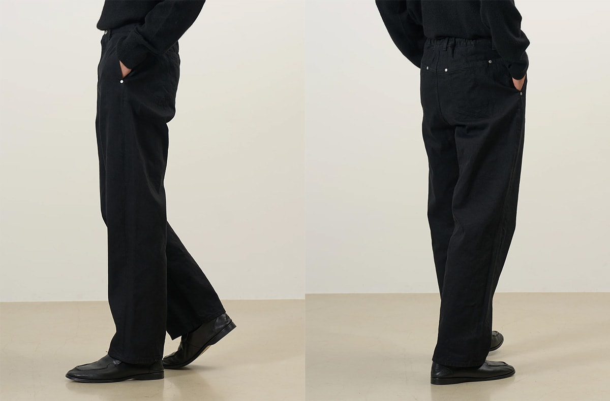 生地にはタテヨコ共に高品質なムラ糸を採用し、奥行きのあるヴィンテージライクな質感を表現。また、サイドやバックのポケットには切り込みを入れることでステッチを減らしたミニマルな印象に仕上げている。さらに、クリーンなシルバーのリベットを配することで、無骨なデニムを洗練された佇まいへと昇華させた。シルエットは裾まで美しく落ちるワイドストレートながら、後ろ身頃に施されたウエストゴムが快適なフィット感になっているのが嬉しいポイント。あらゆるコーディネートに合わせやすい汎用性の高い一本を、ぜひ手にとってみては。