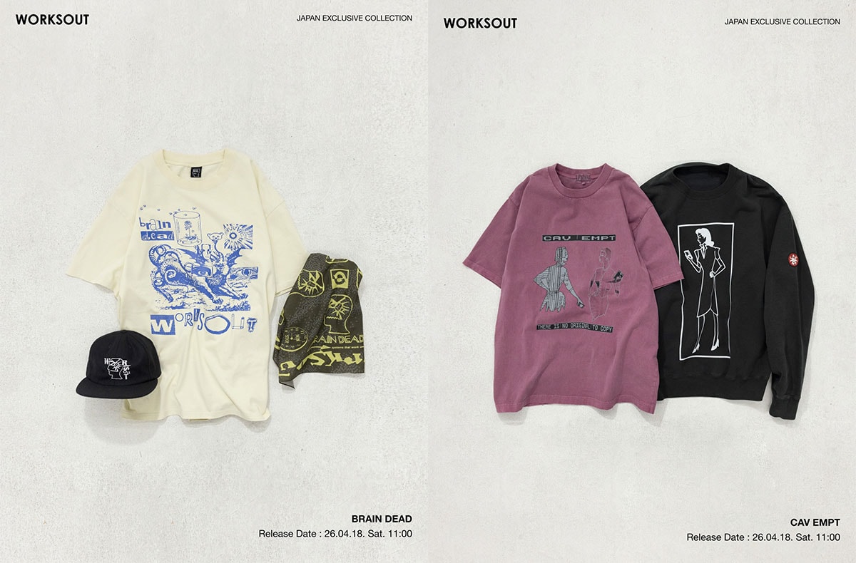「カーハート」は定番のTシャツとデトロイトジャケットのバックにワークスアウトロゴ配置した2型、「ブレインデッド」はグラフィックTシャツ、帽子、バンダナの3型、「シーイー」はスウェットとTシャツの2型、「アリーズ」は”J'adore”グラフィックに同セレクトショップの名前を加えられたTシャツと帽子が2型、「ノープロブレモ」は定番のロゴの下に日本語を配した遊び心溢れるTシャツと帽子の2型がラインナップする。