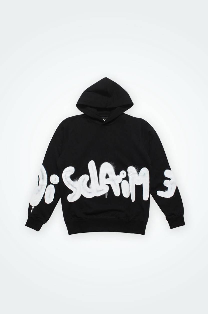 DROPのみの展開となる最新コレクションがリリース。胸元にDISCLAIMERロゴの刺繍を、袖と身頃にダメージ加工を施したシンプルなフーディに加え、フロントにスプレーアートデザインプリントが全面に入ったマフポケット付きフーディがラインナップ。