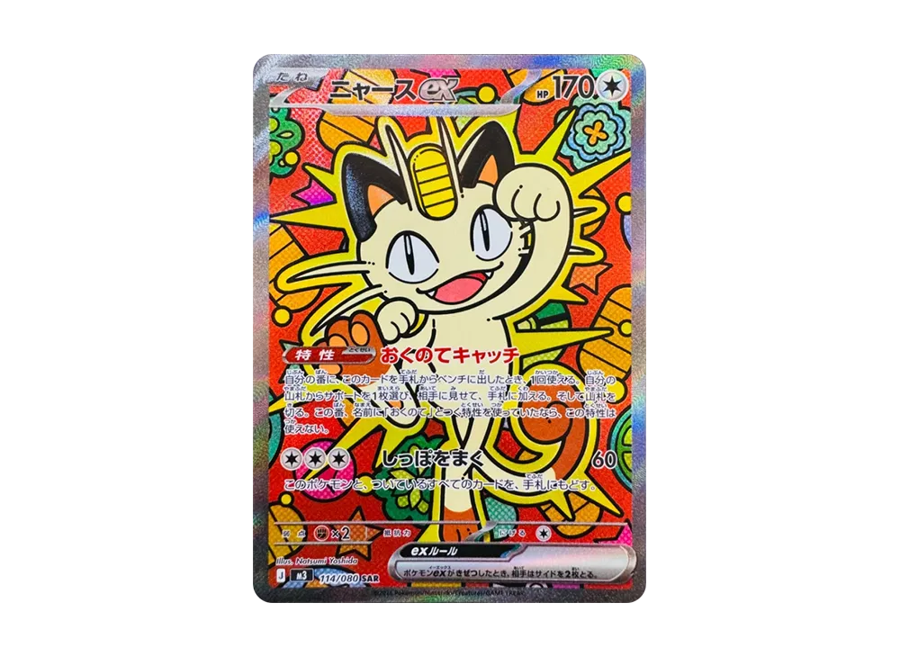 This SAR card leans heavily into that cultural origin. The illustration features a pop-art style with Meowth striking a classic “beckoning” pose. It’s not just a Pokémon card; it feels like a good luck charm. The vibrant, playful design by Natsumi Yoshida makes it a standout display piece.