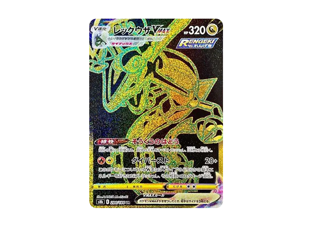 Source: High Class Pack VMAX Climax Why It’s Hot: Black and Gold elegance. This Ultra Rare (UR) features Rayquaza’s silhouette outlined in gold against a jet-black background. Unlike standard URs, this specific style was unique to the VMAX Climax set. The subtle green shading hinting at Rayquaza’s original color adds a touch of luxury that collectors love.