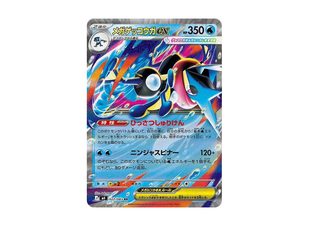Price Spike Analysis Greninja’s popularity is off the charts. Historically, cards like “Ash-Greninja EX” and the “Greninja ex SAR” from the Crimson Haze expansion have easily smashed the ¥20,000 mark. It’s also grabbing attention for its gameplay viability. Its rumored Ability, Lethal Shuriken (which lets you put 6 damage counters on an opponent’s Pokémon by discarding a Basic Water Energy), pairs flawlessly with the new Item card, “Big Catch Net.” A Mega Greninja ex SR would see massive demand from both players and collectors, pushing its value higher than your average SR.