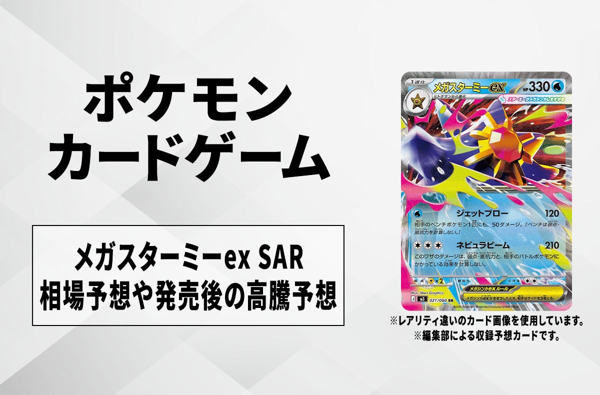 『ポケモンカードゲーム』(ポケカ)より、「メガスターミーex SAR」の相場予想や買取予想、発売後の高騰の考察について紹介。実際の相場情報については、発売後に更