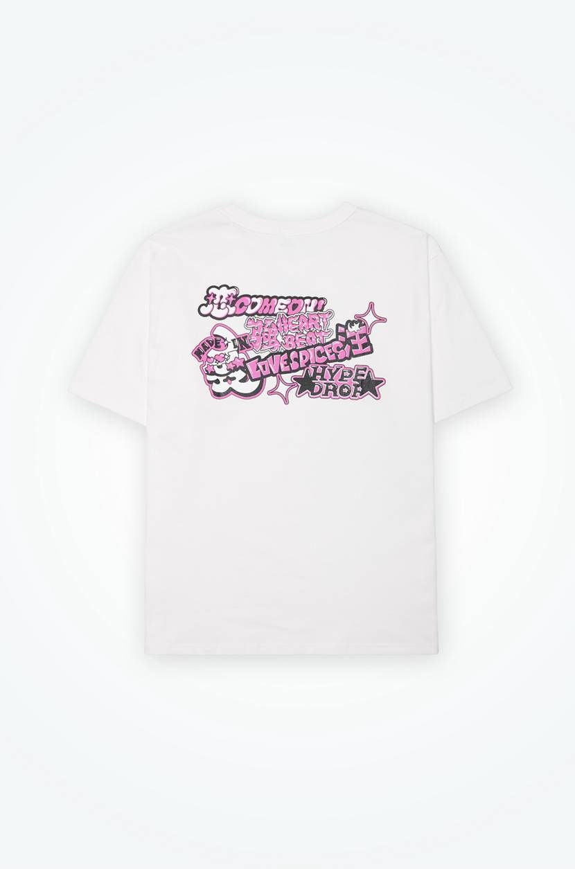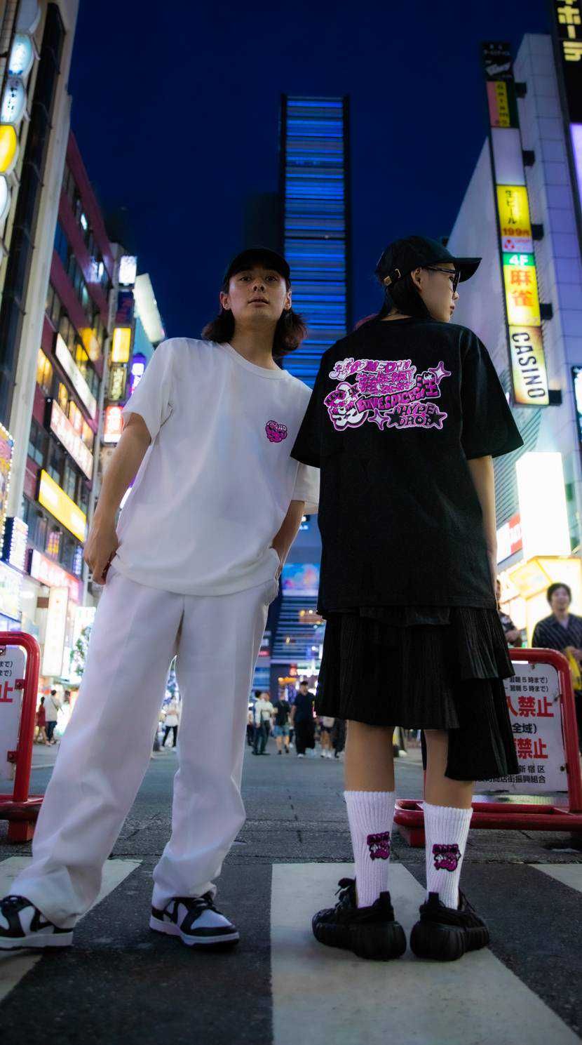 "私から生まれた愛をみんなに届けたい"をテーマに、ハヤシレナ氏が手掛けたポップで明るいデザインを落とし込んだTシャツとキャップ、ソックスがDROP。Tシャツは昔の魔法少女っぽいアニメのようなレトロデザインで表現したバックプリントを大胆に配置し、ブラックとホワイトの2色展開となっている。キャップとソックスには可愛らしいワンポイント刺繍をボディの後ろに施している。いずれもFruit of the Loomとのコラボで生地はヘビーウェイトのものがベースとなっているため、長く愛用できるアイテムとなっている。