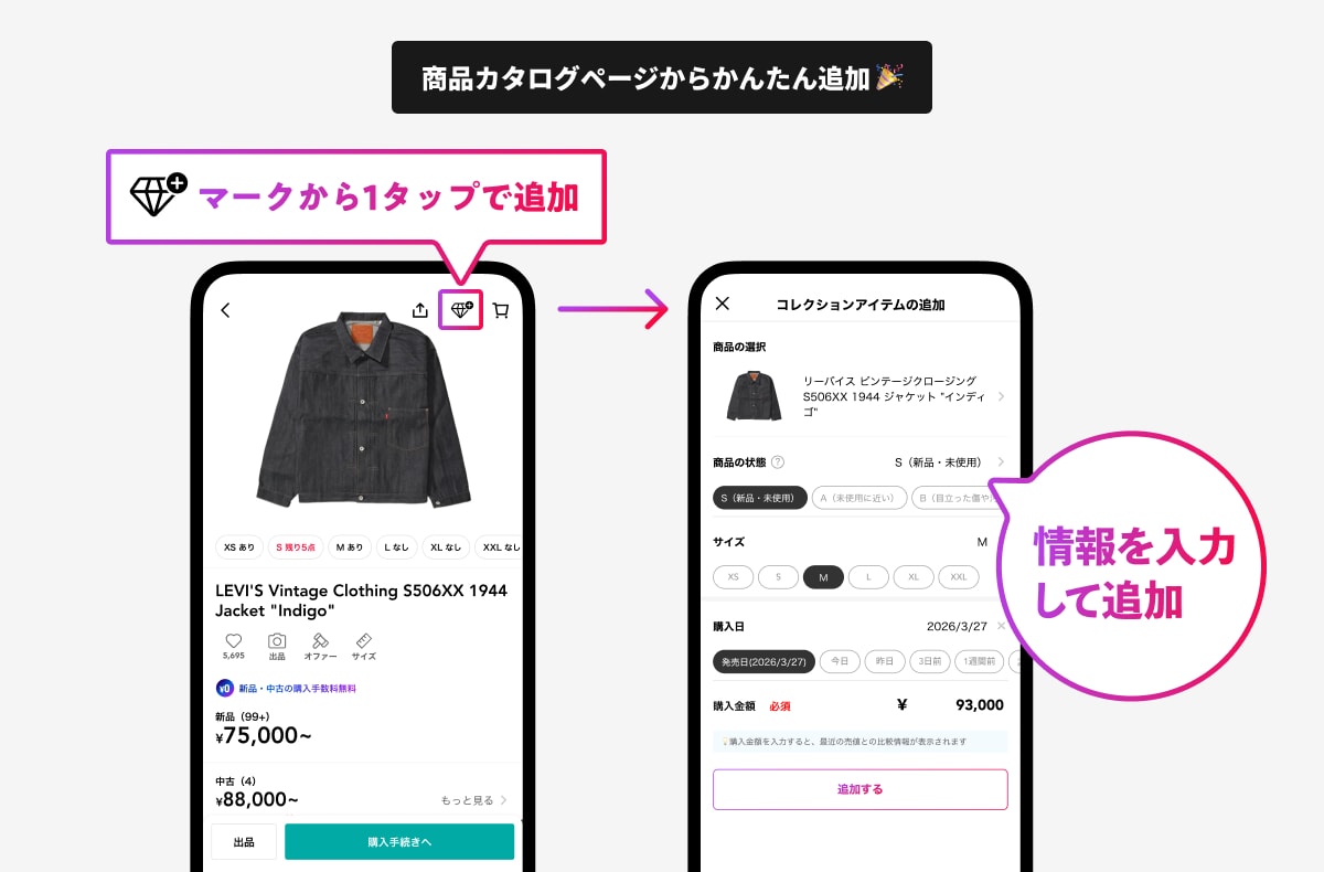 コレクションへのアイテム追加は、商品カタログページから1タップで追加できます。