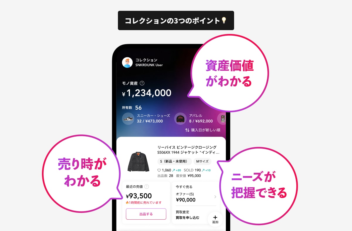 ・スニダンでの取引実績がないアイテムには、コレクション登録時の購入金額で資産価値が算出されます