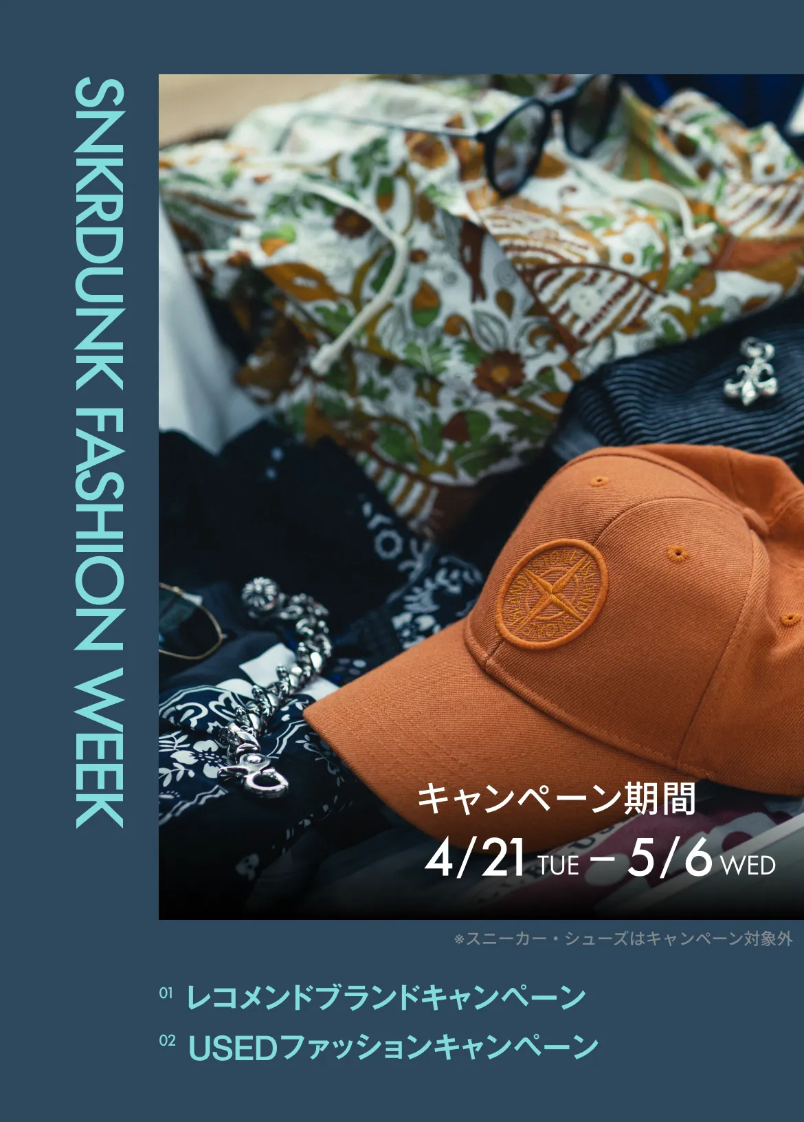 ■キャンペーン名 対象ブランドアパレルに使えるクーポン配布キャンペーン ◻︎クーポン取得・利用期間 2026年4月21日(火)〜5月6日(水)23:59:59 ◻︎クーポン内容 対象ブランドアパレルに使える 20%OFF(最大5,000円OFF)クーポン 有効期限:2026年5月6日(水)23:59:59まで有効 ※配送料は割引対象外です 利用上限700枚 ※700枚のクーポン利用上限に達すると取得したクーポンはご利用いただけなくなります 対象ブランド sacai/Saint mxxxxxx/AURALEE/COMOLI/NEEDLES/Engineered Garments/ENNOY/COMME des GARCONS HOMME/COMME des GARCONS HOMME PLUS/JUNYA WATANABE MAN/Chrome Hearts /STONE ISLAND/Levis/adidas 対象カテゴリ アパレル・アクセ・バッグ・財布・小物・時計・帽子 ◻︎取得方法 会員登録後、アプリで開いた際にこのページに表示される「クーポンを取得する」から取得 ※クーポン獲得にはSMS認証が必要です 【利用条件】 本クーポンは、対象カテゴリの3,000円以上の商品にご利用いただけます 本クーポンは、ブランド公式販売商品にはご利用いただけません 一度のご購入またはオファーにつき、利用できるクーポンは1枚のみです 本クーポンは利用上限数があり、利用上限に達すると取得したクーポンはご利用いただけなくなります 【オファーでのご利用について】 クーポンを使用したオファーの金額変更はできません オファーをキャンセルした場合、クーポンは自動的に再付与されます ※再付与時に有効期限は延長されないため、キャンセル時点でクーポンの期限が切れていた場合にはそのまま失効となります 【取引キャンセル時の対応】 取引がキャンセルとなった場合、クーポンは自動的に再付与されます ※再付与時に有効期限は延長されないため、キャンセル時点でクーポンの期限が切れていた場合にはそのまま失効となります ■キャンペーン名 USEDアパレル購入キャンペーン ◻︎クーポン取得・利用期間 2026年4月21日(火)〜5月6日(水)23:59:59 ◻︎クーポン内容 Usedアパレルに使える 20%OFF(最大5,000円OFF)クーポン 有効期限:2026年5月6日(水)23:59:59まで有効 ※配送料は割引対象外です 利用上限200枚 ※200枚のクーポン利用上限に達すると取得したクーポンはご利用いただけなくなります 対象カテゴリ アパレル・アクセ・バッグ・財布・小物・時計・帽子 対象商品状態 A(未使用に近い)~E(全体的に状態が悪い) ◻︎取得方法 会員登録後、アプリで開いた際にこのページに表示される「クーポンを取得する」から取得 ※クーポン獲得にはSMS認証が必要です 【利用条件】 本クーポンは、対象カテゴリの3,000円以上の商品にご利用いただけます 本クーポンは、ブランド公式販売商品にはご利用いただけません 一度のご購入またはオファーにつき、利用できるクーポンは1枚のみです 本クーポンは利用上限数があり、利用上限に達すると取得したクーポンはご利用いただけなくなります ◾️キャンペーン名 出品手数料ポイント還元キャンペーン ◻︎キャンペーン内容 キャンペーン期間中、対象カテゴリの商品を新規出品のうえ販売いただくと、販売手数料を最大全額ポイント還元いたします ◻︎キャンペーン特典 期間中に出品いただく商品の状態によって特典が異なります 商品状態:S(新品)、A+(新品(ワケあり)) 販売手数料半額ポイントバック(最大3,000P) 商品状態:A(未使用に近い)~E(全体的に状態が悪い) 販売手数料全額ポイントバック(最大20,000P) ◻︎対象者 会員登録後、キャンペーン期間内にアプリの本ページ内「キャンペーンに参加」ボタンをタップしていること ◻︎キャンペーン対象期間 2026年4月21日(火)00:00 〜 2026年5月6日(火)23:59 ◻︎対象カテゴリ アパレル、バッグ、財布、アクセサリー、時計、服飾品 ※スニーカーなど、上記以外のカテゴリは対象外です ◻︎キャンペーンポイントの付与について 付与日:2026年5月20日(水)23:59までに反映 有効期限:付与日から30日間 ◻︎ポイント還元の3つの条件 以下のすべてを満たす取引が対象となります。 1. キャンペーンへの参加 会員登録後、キャンペーン期間内にアプリの本ページ内「キャンペーンに参加する」ボタンをタップしていること。 2. 期間中の「新規出品」 2026年4月21日(火)00:00以降に対象の商品を新しく出品すること。 3. 期間内の「鑑定通過」 2026年5月16日(土)23:59までに鑑定を通過(取引完了)すること。 ◾️注意事項 【対象ケースについて】 ・キャンペーン期間内に「新規出品」した商品であれば、参加ボタンを押す前に売れた場合でも、後から参加ボタンをタップすることで対象に含めることができます ・キャンペーンの開始前から出品されていた商品は、キャンペーン期間中に取引成立および鑑定通過してもキャンペーンの対象外です ・取引がキャンセルになった場合、キャンペーンの対象外となります 【ポイント付与について】 ・合計取引額に応じたポイントを算出し、一括で付与いたします。反映が遅れる場合もございますのであらかじめご了承ください ・付与日までに退会、または利用制限となっている場合は付与対象外で