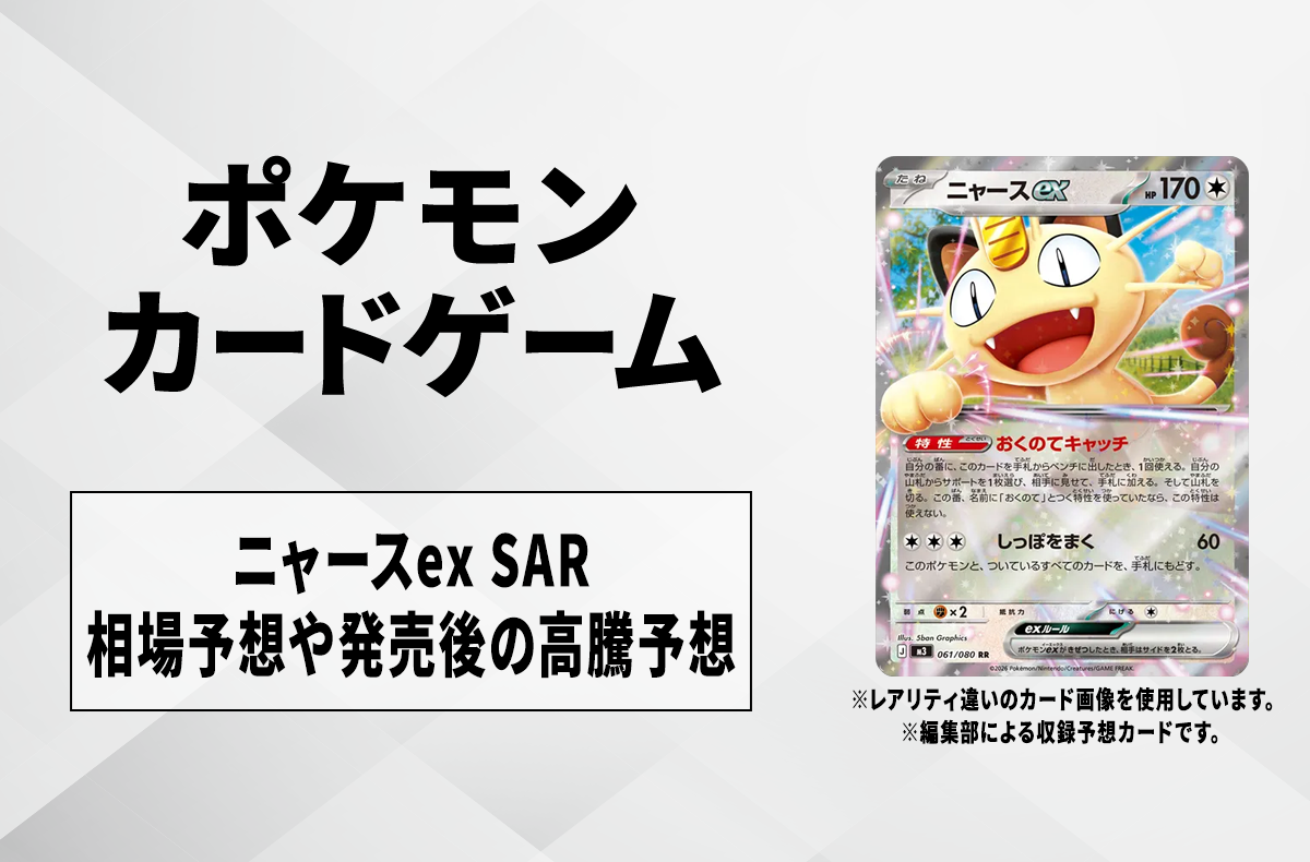 『ポケモンカードゲーム』(ポケカ)より、「ニャースex SAR」の相場予想や買取予想、発売後の高騰の考察について紹介。実際の相場情報については、発売後に更新予定