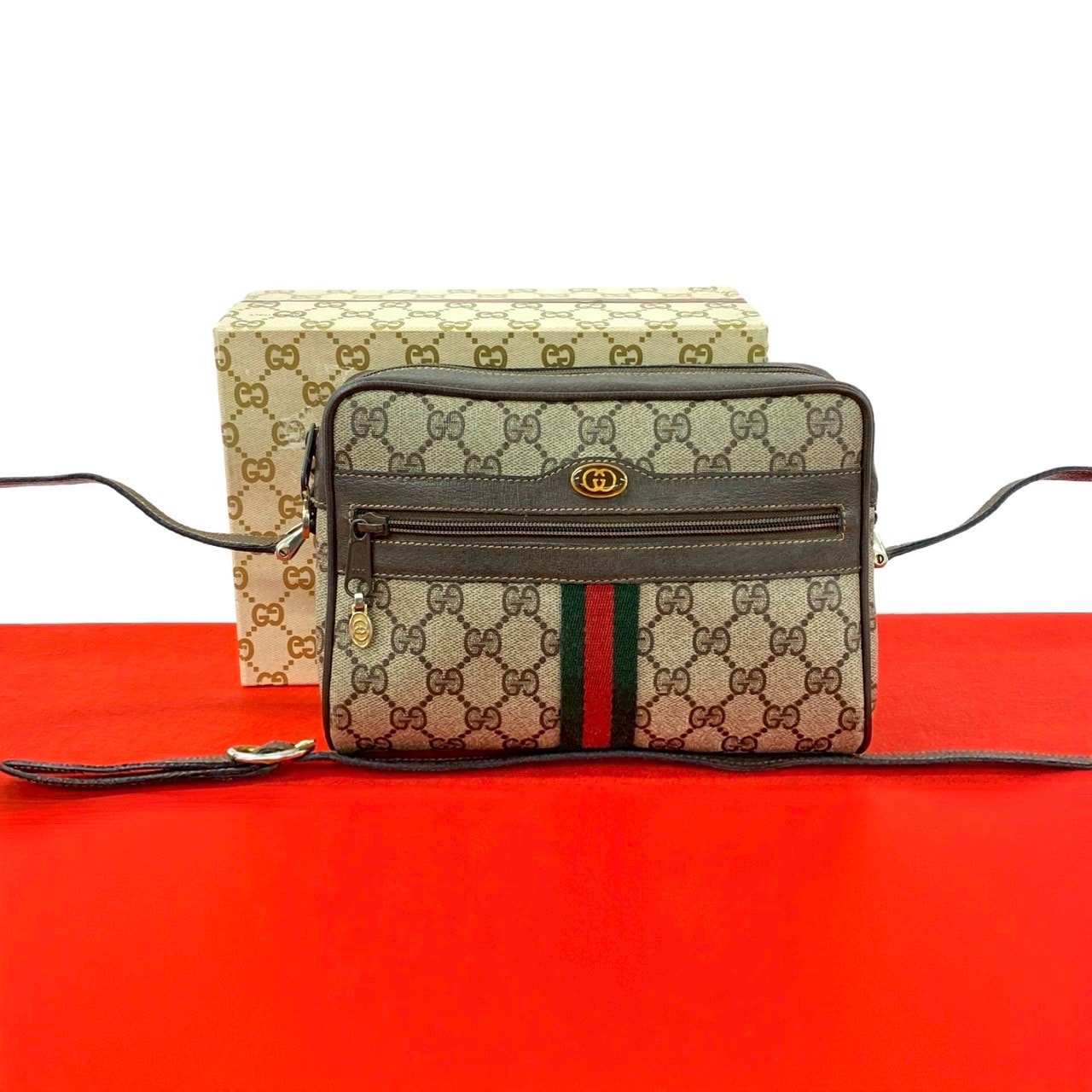 GUCCI グッチ シェリーライン GG ロゴ PVC レザー ショルダーバッグ ブラウン