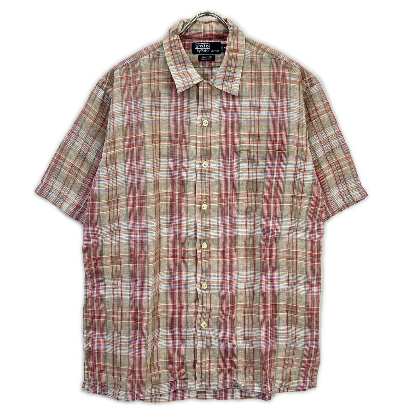 ポロ ラルフローレン 90年代 CLAYTON クレイトン チェック リネン100 オープンカラーシャツ M