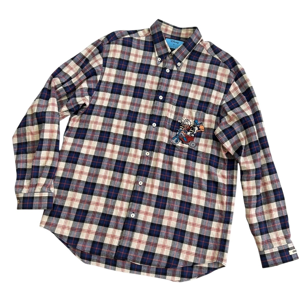 GUCCI グッチ DISNEY ディズニー ドナルドダッグ チェックシャツ 長袖シャツ 46 コットン 麻・リネン ネイビー アイボリー レッド メンズ【中古】