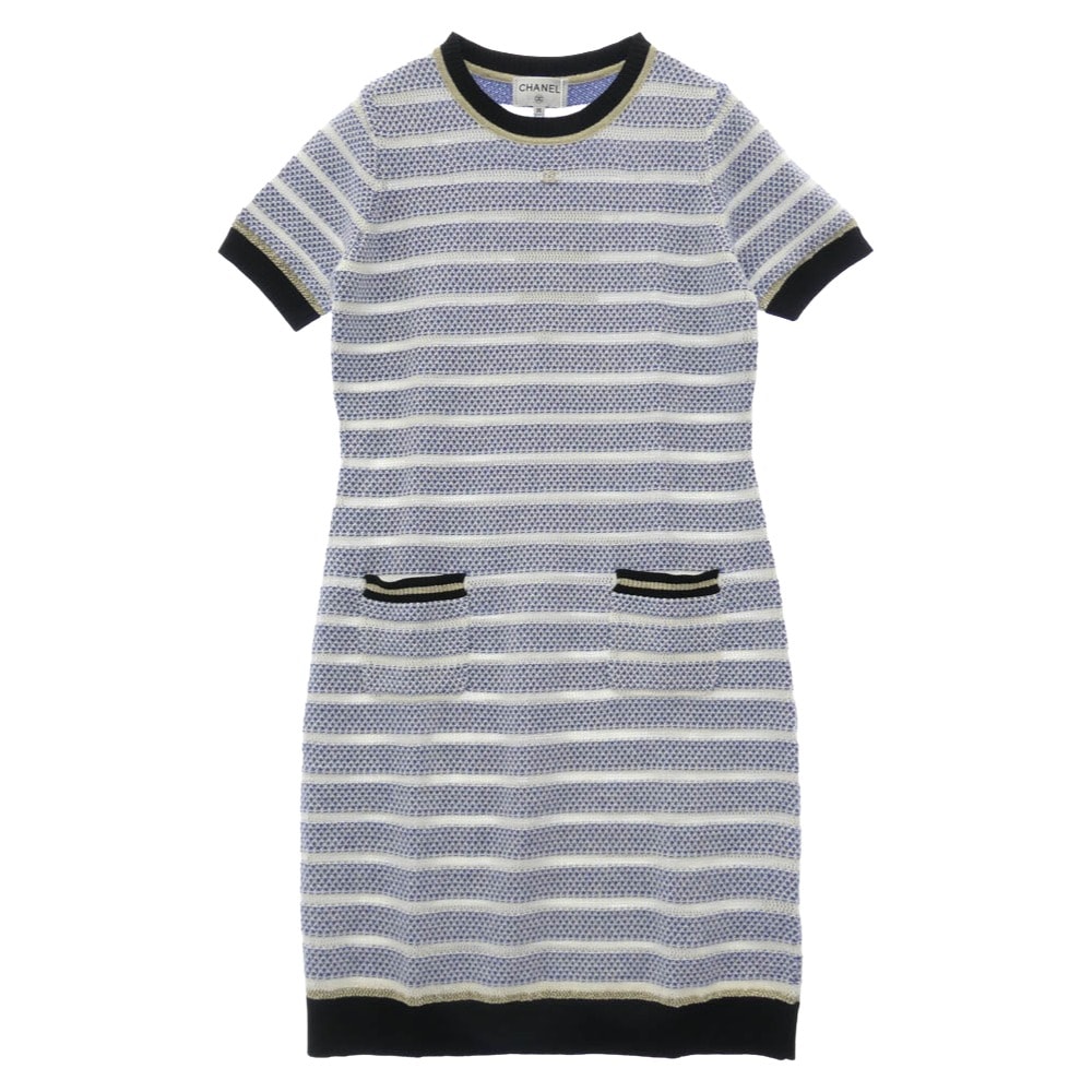 CHANEL シャネル ワンピース P70375K10017 NB041 イタリア製 カシミヤ ウール ストライプ柄 スモール スパンコール ニット 半袖 ワンピース ブルー系 ホワイト系 36【極上美品】【中古】