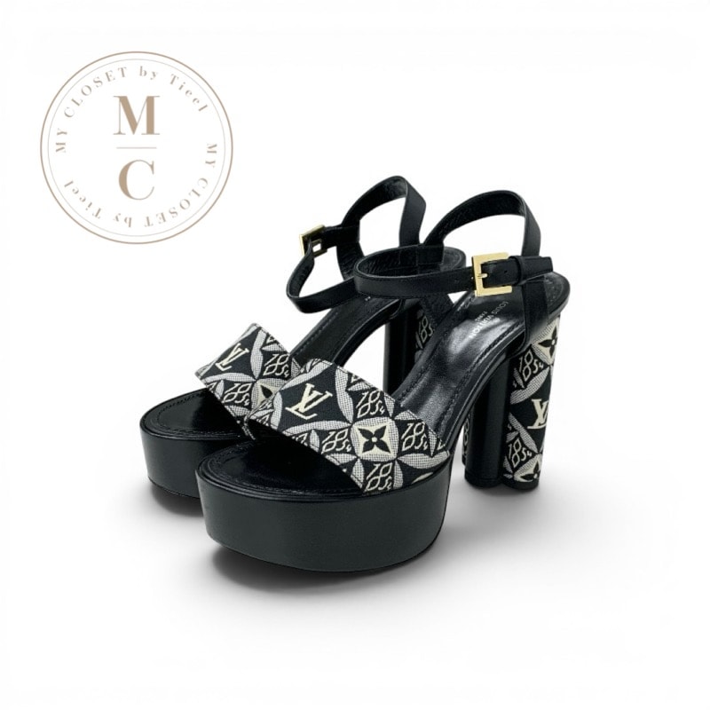 ルイヴィトン LOUIS VUITTON ポディウムライン モノグラム サンダル 靴 シューズ ファブリック レザー ブラック ホワイト LVロゴ プラットフォーム ストラップ