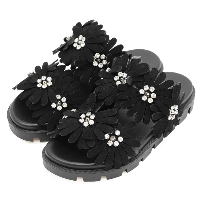 【未使用】Christian Louboutin クリスチャンルブタン サンダル 38.5 レディース FLORA COOL FLAT クリスタルビジュー & スタッズ スエード フラワーストラップ ナッパレザー シューズ 革靴 付属有 ブラック 黒 伊製