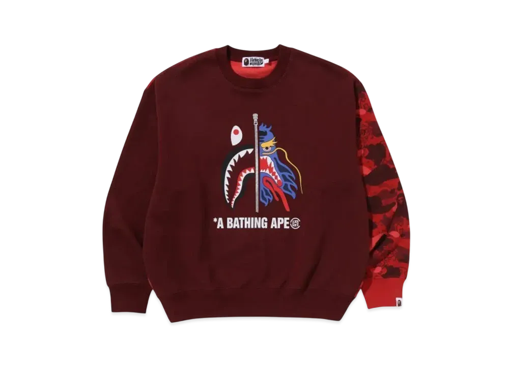 A BATHING APE x CLOT Camo Shark Patched Relaxed Fit Crewneck Sweatshirt "Red"