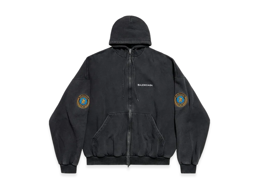 BALENCIAGA Men's Uniform Patch Zip-Up Hoodie Large Fit "Fade Black"