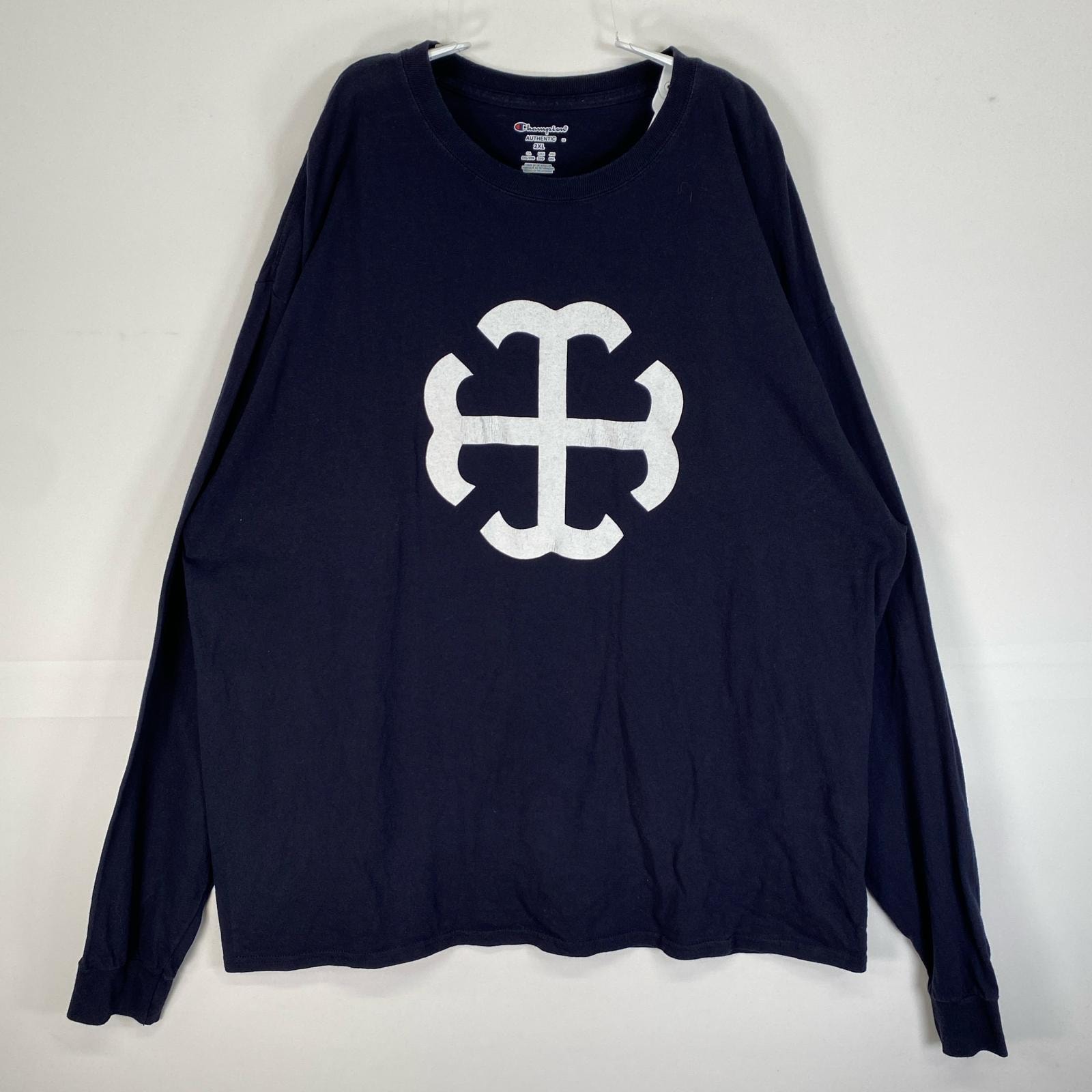古着 チャンピオン Champion 長袖Tシャツ カレッジ 大きいサイズ クルーネック 2XL ネイビー プリント メンズ