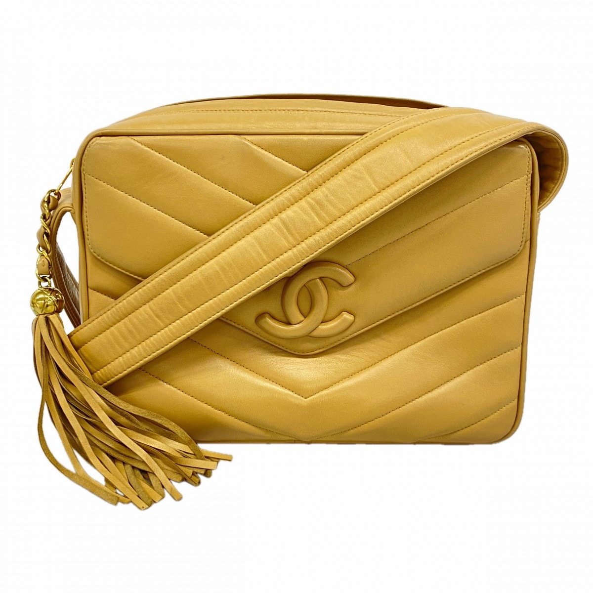 【6da0245-k】シャネル ショルダーバッグ Vステッチ フリンジショルダー ラムスキン ベージュ ゴールド金具【中古】レディース