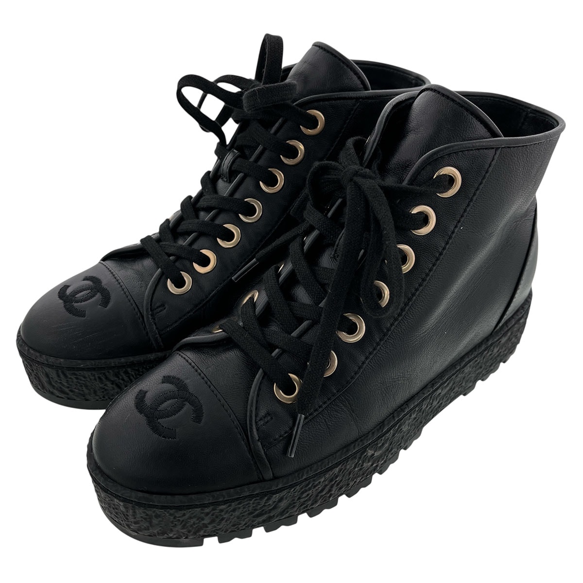 CHANEL シャネル レースアップ ブーツ 約23cm G39098 レザー ブラック レディース【中古】