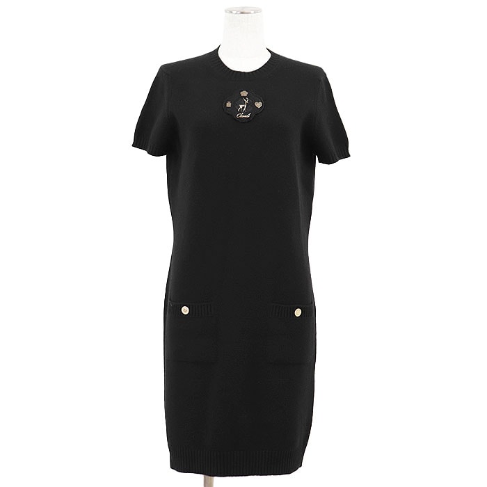 【美品】CHANEL シャネル ワンピース 09A P36450 レディース サイズ 40 カメリアアイコン ワッペン メッシュ ハート トナカイ 香水瓶 COCOマーク カシミヤ100% ショートスリーブ ブラック 黒 イギリス製 カール・ラガーフェルド期