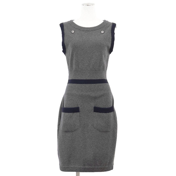 【美品】CHANEL シャネル ニット ワンピース 08A P34433 レディース サイズ 38 COCOマーク ロゴ チャーム ウエストリブ ノースリーブ バイカラー ウール グレー ネイビー 紺 灰色 フランス製 カール・ラガーフェルド期 2008年製